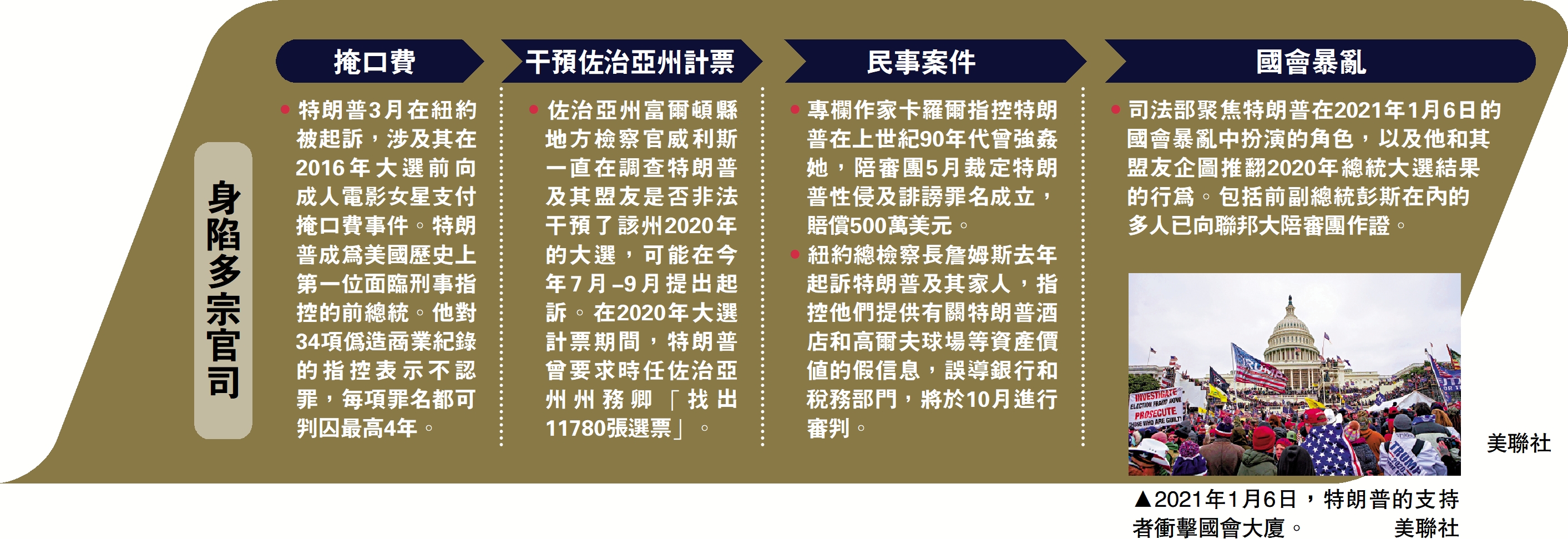 •特朗普3月在紐約被起訴,涉及其在2016年大選前向成人電影女星支付掩口費事件。特朗普成為美國歷史上第一位面臨刑事指控的前總統。他對34項偽造商業紀錄的指控表示不認罪,每項罪名都可判囚最高4年。