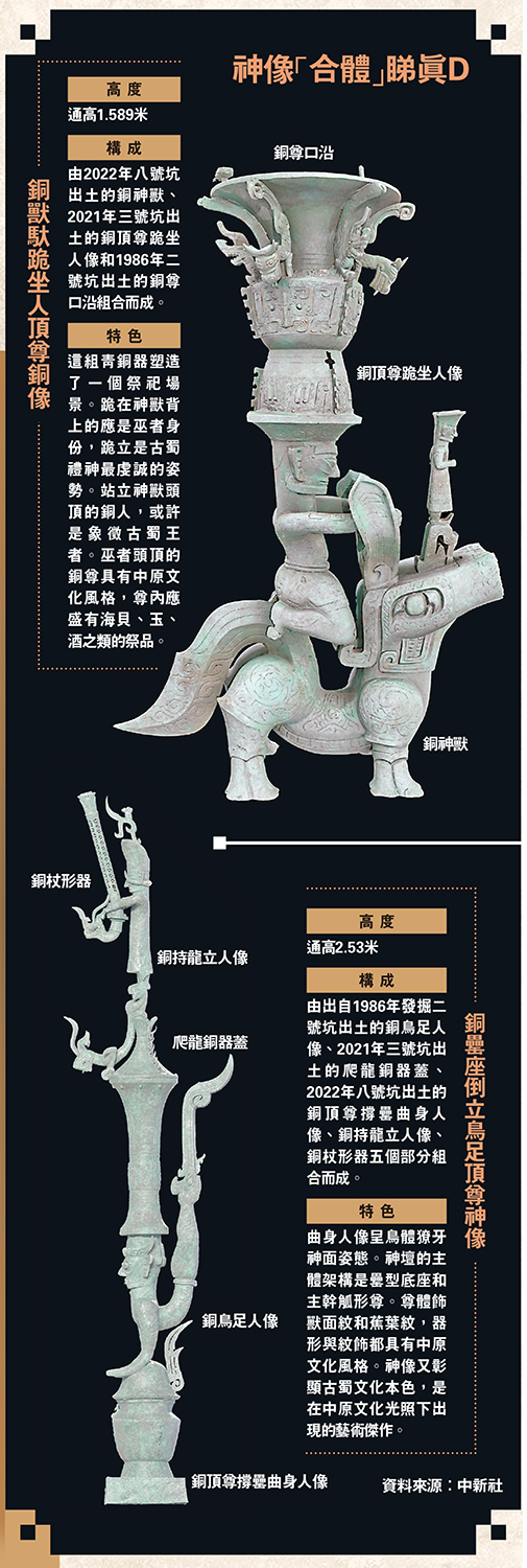 構 成:由出自1986年發掘二號坑出土的銅鳥足人像、2021年三號坑出土的爬龍銅器蓋、2022年八號坑出土的銅頂尊撐罍曲身人像、銅持龍立人像、銅杖形器五個部分組合而成。