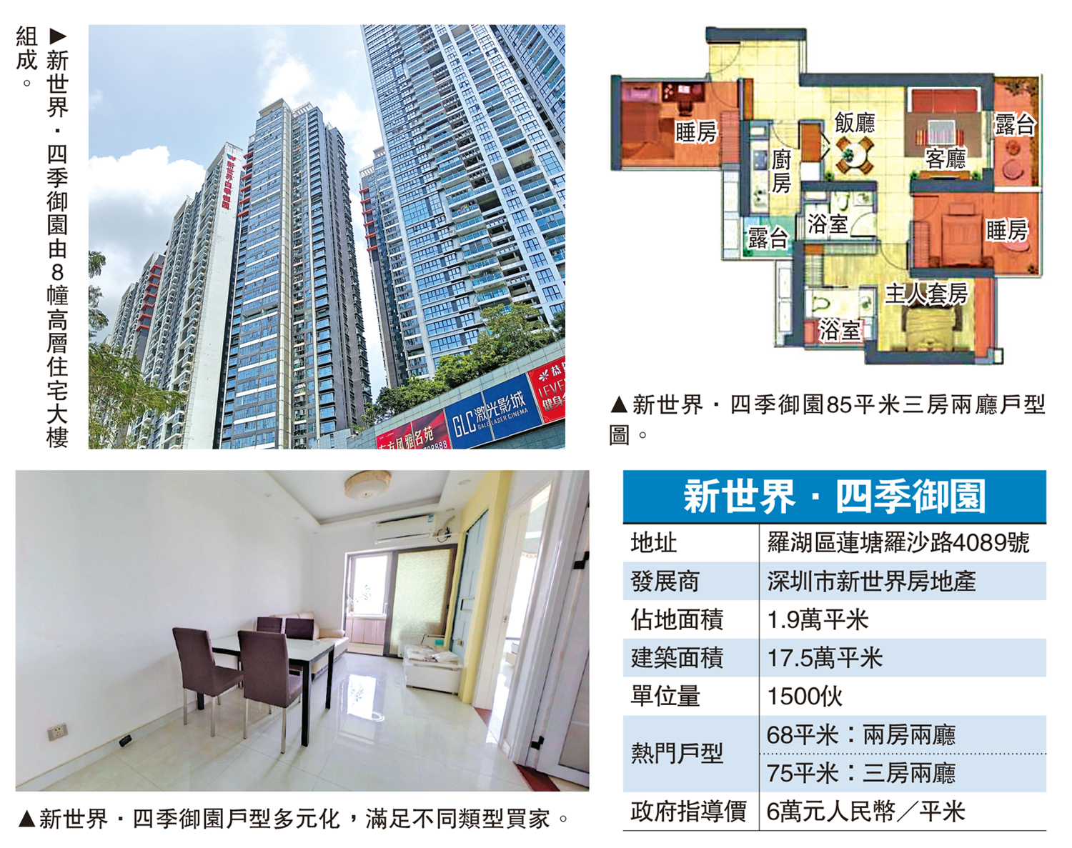 樂有家蓮塘鵬興一期店店長葉明發介紹,新世界·四季御園位於蓮塘片區西側,於2014年入伙,南側與深圳河相鄰,並且與蓮塘口岸接駁。項目有1.1萬平米商場、2萬平米的辦公樓,車位共1065個。政府指導價為每平米6萬元人民幣,與市場價接近。