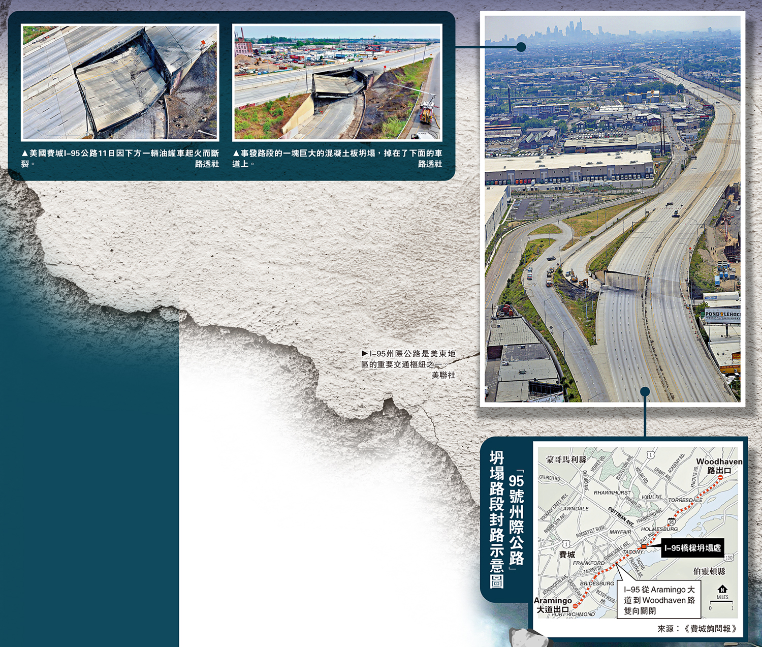 【大公報訊】綜合法新社、美聯社、《費城詢問報》報道:當地時間11日早晨,位於美國賓夕法尼亞州費城、美國最繁忙高速公路之一「95號州際公路」(I-95)的一處高架橋發生坍塌事故,起因是一輛油罐車在行經下方時起火燃燒。目前暫時沒有發現有人員受傷,事故還可能引起地下爆炸。賓夕法尼亞州州長夏皮羅表示,公路恐要耗時多月才能完全恢復。作為美東地區南北向的交通動脈,事故恐影響人們通勤和運輸,交通部門發出提醒,建議通勤人士繞路而行。