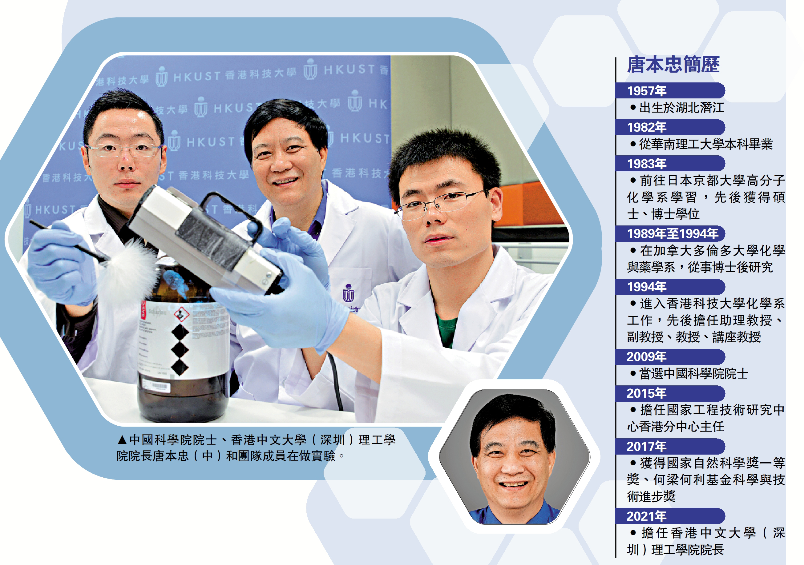 如果有一種新冠病毒檢測試劑,可以讓病毒一接觸就肉眼可見;如果有一種會發光的衣服,可以檢測細菌……這些奇思妙想,在中國科學院院士、香港中文大學(深圳)理工學院院長唐本忠的實驗室裏正從「天方夜譚」逐步變為可能。2001年,唐本忠提出的原創性科學概念聚集誘導發光(AIE),被視為光材料研究領域的重大突破,打造了一個中國人「領跑」世界的學術流派,也為「中國智造」提供了新思路。唐本忠指出,只要能設計出合適的AIE分子,基本上任何東西都可以檢測。\大公報記者 李望賢