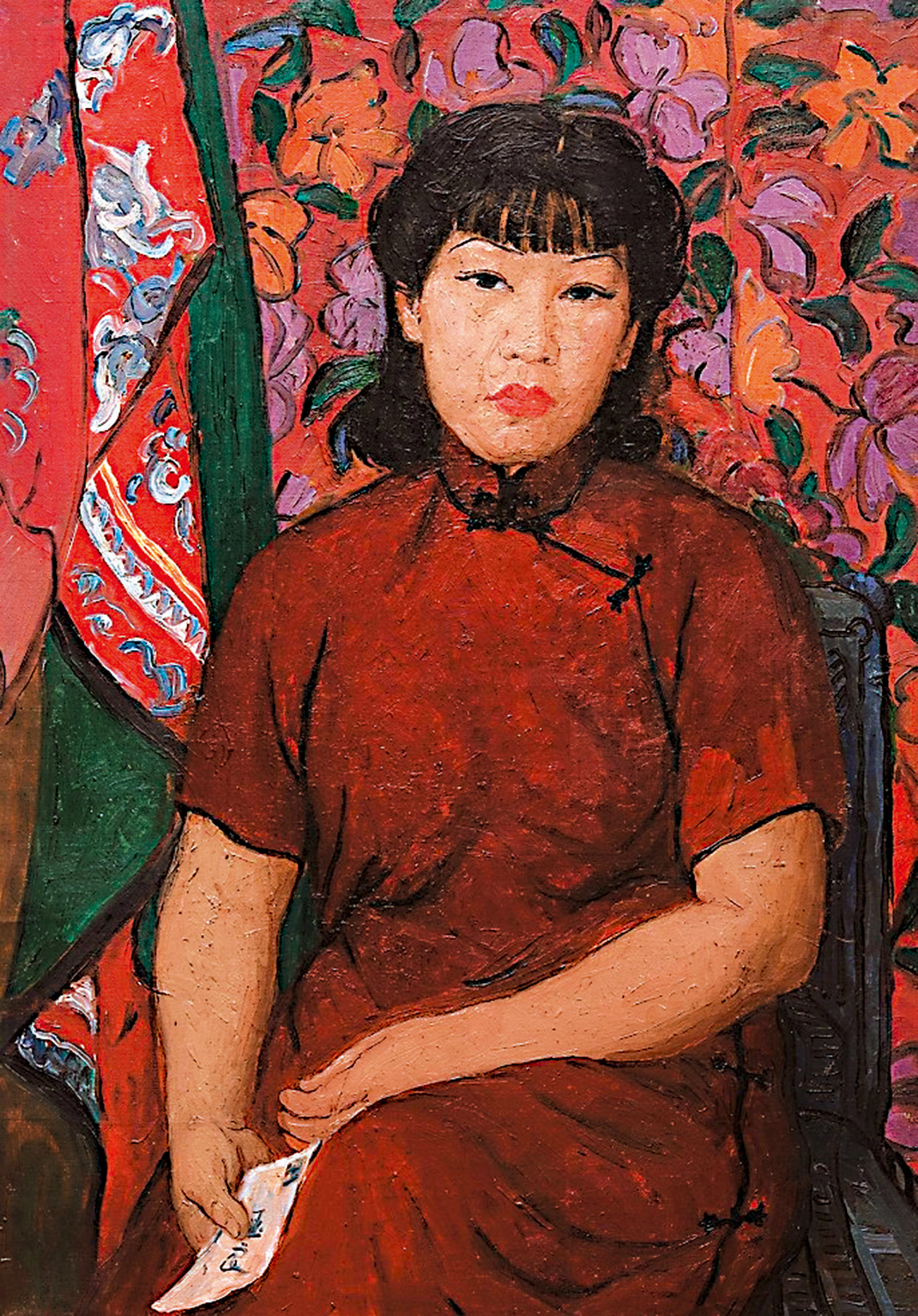 潘玉良旅法四十餘年,於巴黎病逝。按其遺願,她的超過四千件作品被運回故鄉,多數收藏在安徽博物院。館藏《紅衣自畫像》(附圖)是其代表作之一,二○一八年曾在香港「春之歌」大展亮相。畫作人物風格寫實,背景卻大多是平面、顏色鮮艷,有野獸派大師馬蒂斯的影子,而完成畫作後,她也用線條勾勒出主要輪廓,帶有東方水墨的筆意,顯示她早期融會中西的嘗試。
