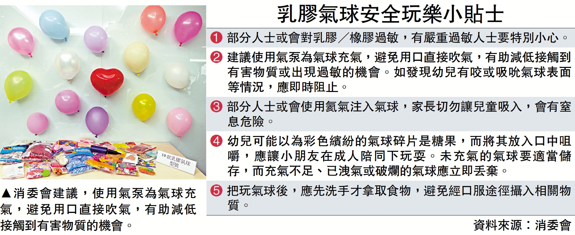 乳膠氣球是布置派對的必備佳選,不過深受兒童喜愛的氣球隱藏不少安全問題。消費者委員會檢測市面上19款乳膠氣球產品型號,發現近七成型號未能符合歐盟相關的玩具安全規定,全部樣本檢出不同種類的亞硝胺化合物或可亞硝化物質,部分屬懷疑致癌物。消委會建議有關執法部門參考相關標準加強抽驗,市民可使用氣泵為氣球充氣,或考慮以較環保的裝飾代替氣球。
