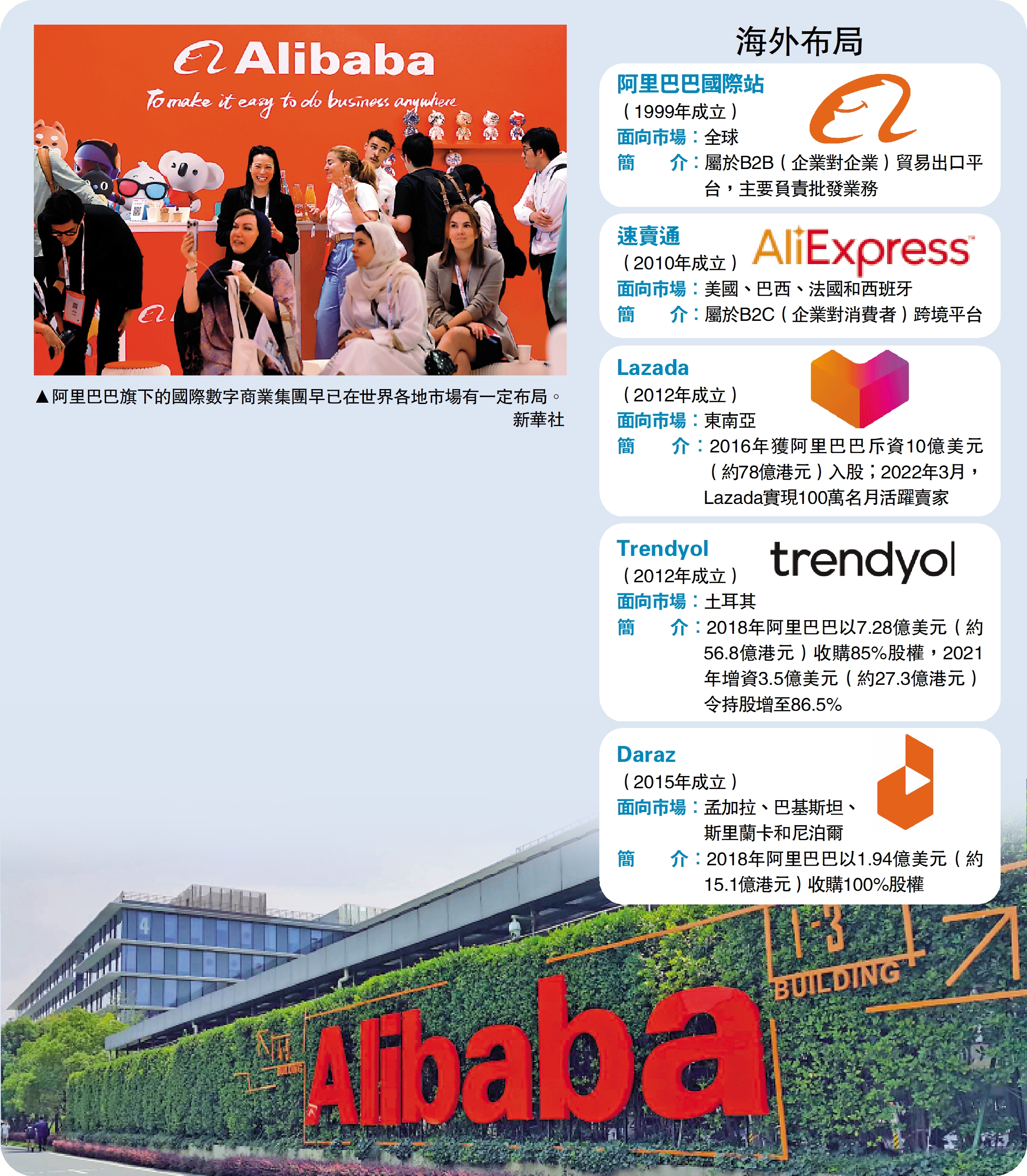在阿里巴巴的生態體系,國際數字商業集團已有一定布局,包括早於1999年成立面對全球的B2B(企業對企業)貿易出口平台──阿里巴巴國際站;另外,速賣通負責美國、巴西、法國和西班牙市場,Lazada負責東南亞地區,還有負責土耳其地區的Trendyol,以及重點發展南亞市場的Daraz,覆蓋孟加拉國、巴基斯坦、斯里蘭卡和尼泊爾。
