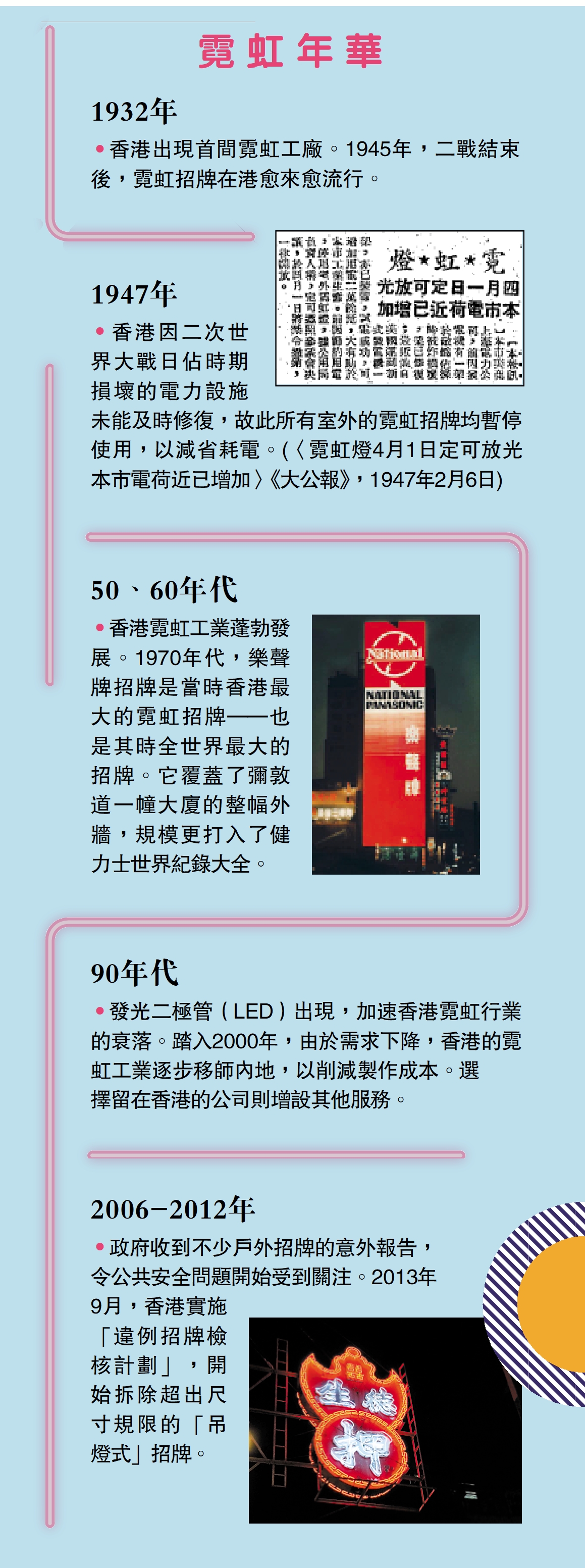 •香港出現首間霓虹工廠。1945年,二戰結束後,霓虹招牌在港愈來愈流行。