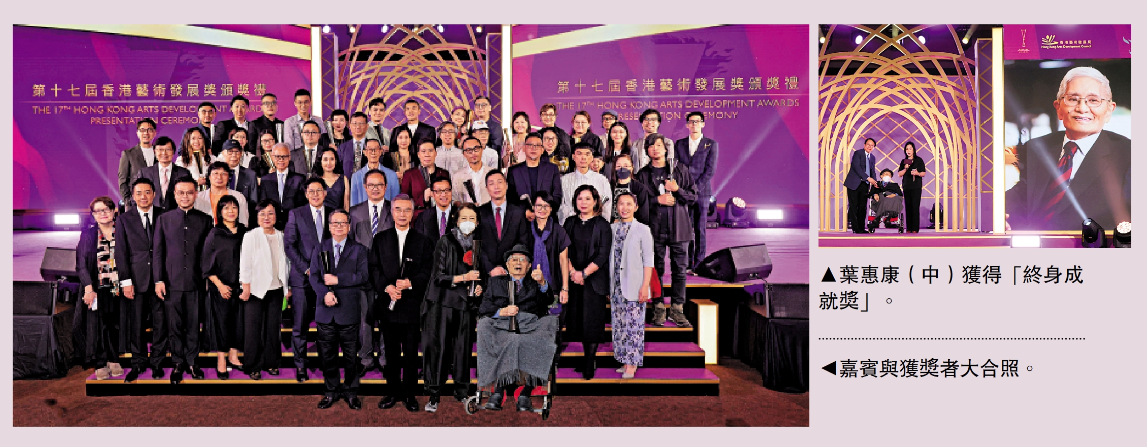 【大公報訊】由香港藝術發展局(藝發局)主辦的「第十七屆香港藝術發展獎」頒獎禮,於昨日(17日)在九龍灣國際展貿中心舉行,頒出6個獎項類別、共27個獎項予本地藝術工作者、團體、學校及機構,以表揚他們在藝術方面的成就,以及在推動香港藝術發展方面的貢獻。其中最高榮譽大獎「終身成就獎」由被譽為「香港兒童合唱團之父」的葉惠康獲得。