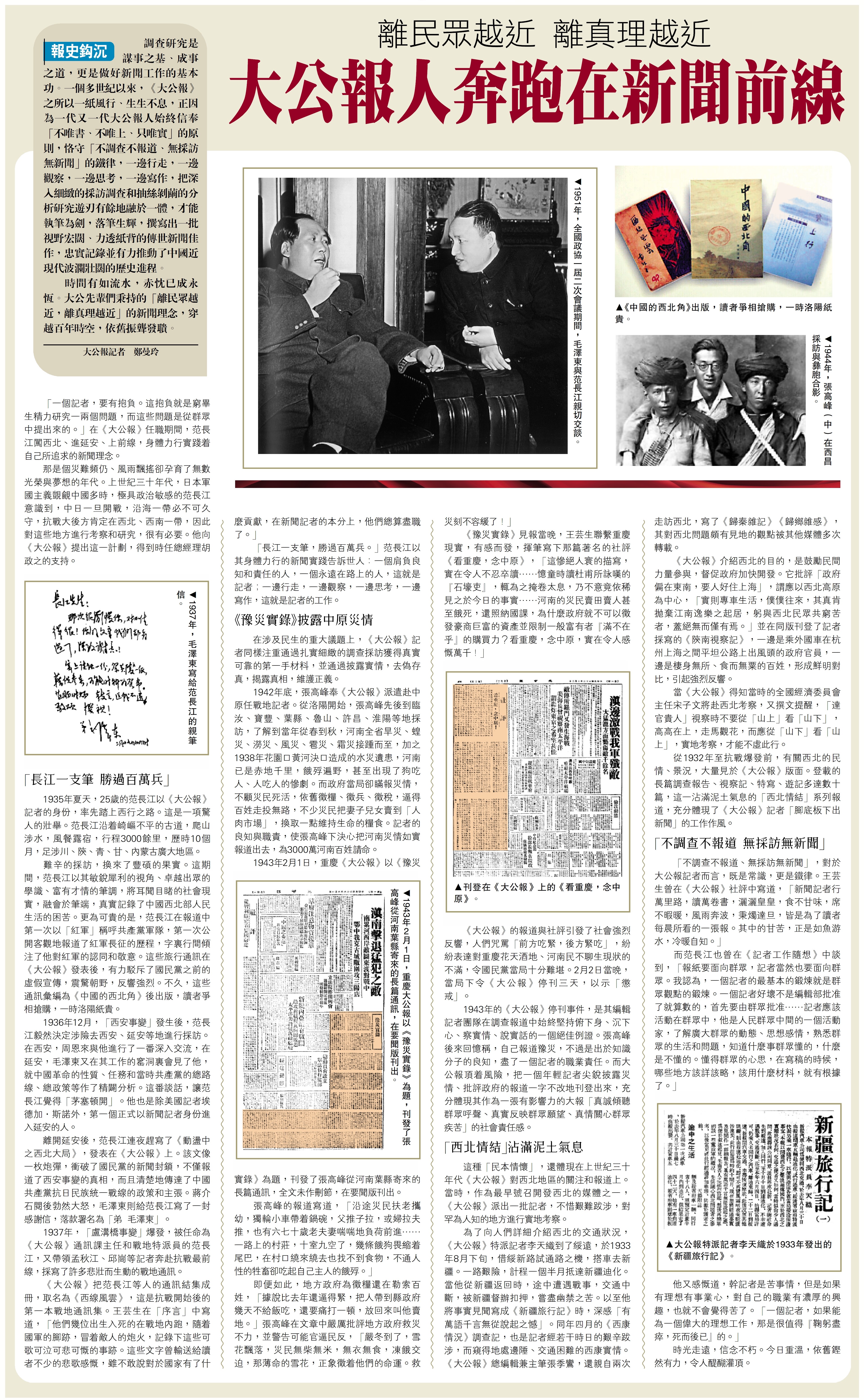 「不調查不報道、無採訪無新聞」,對於大公報記者而言,既是常識,更是鐵律。王芸生曾在《大公報》社評中寫道,「新聞記者行萬里路,讀萬卷書,灑灑皇皇,食不甘味,席不暇暖,風雨奔波,秉燭達旦,皆是為了讀者每晨所看的一張報。其中的甘苦,正是如魚游水,冷暖自知。」