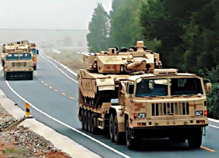 訓練中,重型坦克運輸車亮相。該型車輛,可運輸近60噸的99A坦克翻山越嶺,千里機動。相比輪式車輛,履帶車輛重量大、裝甲厚,運行時系統機械損耗更大。為降低坦克的非戰鬥損耗,長途轉移時便需要借助運載平台。而對於坦克這樣的重裝備,普通卡車無法升任。