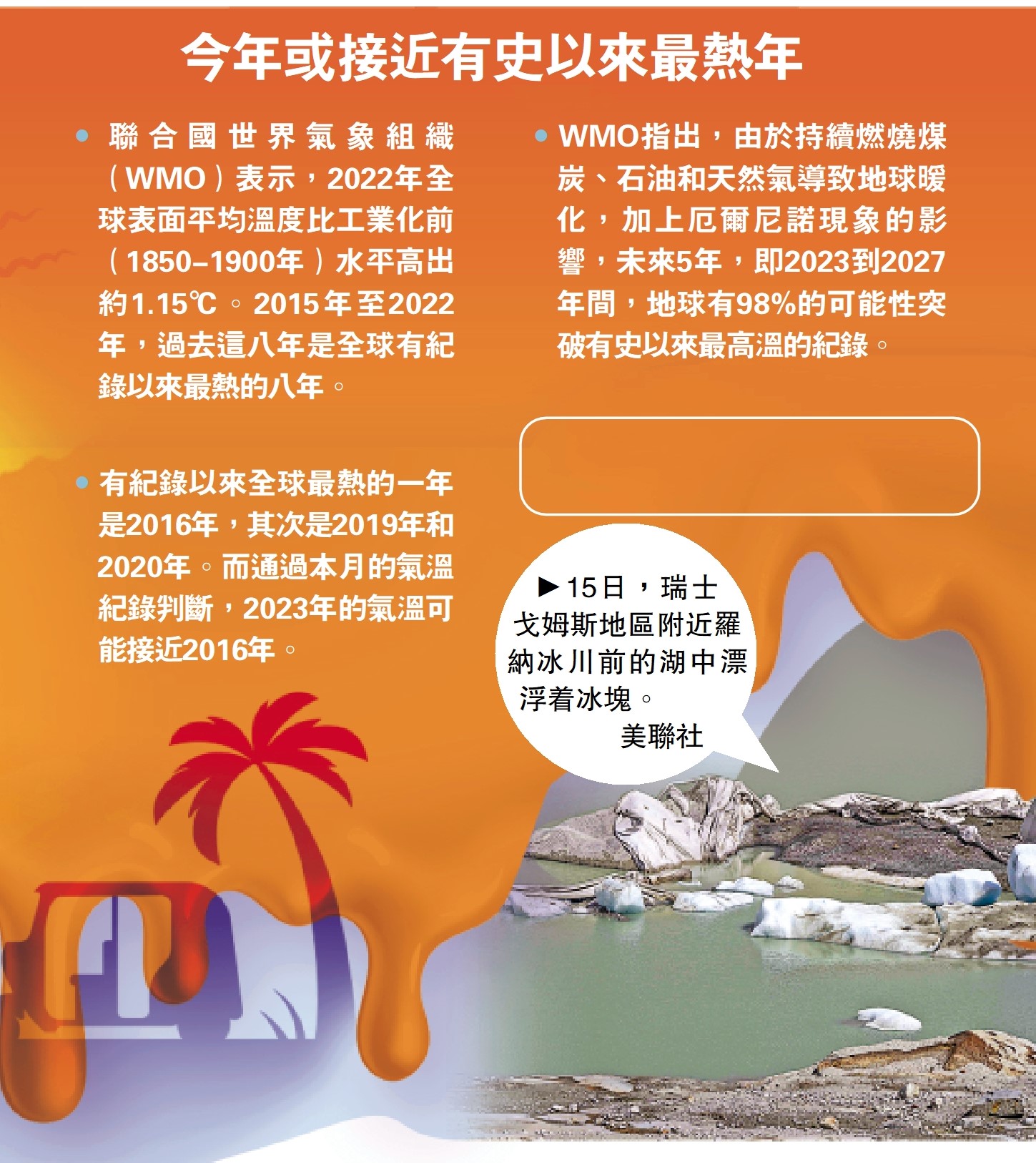 •聯合國世界氣象組織(WMO)表示,2022年全球表面平均溫度比工業化前(1850-1900年)水平高出約1.15℃。2015年至2022年,過去這八年是全球有紀錄以來最熱的八年。