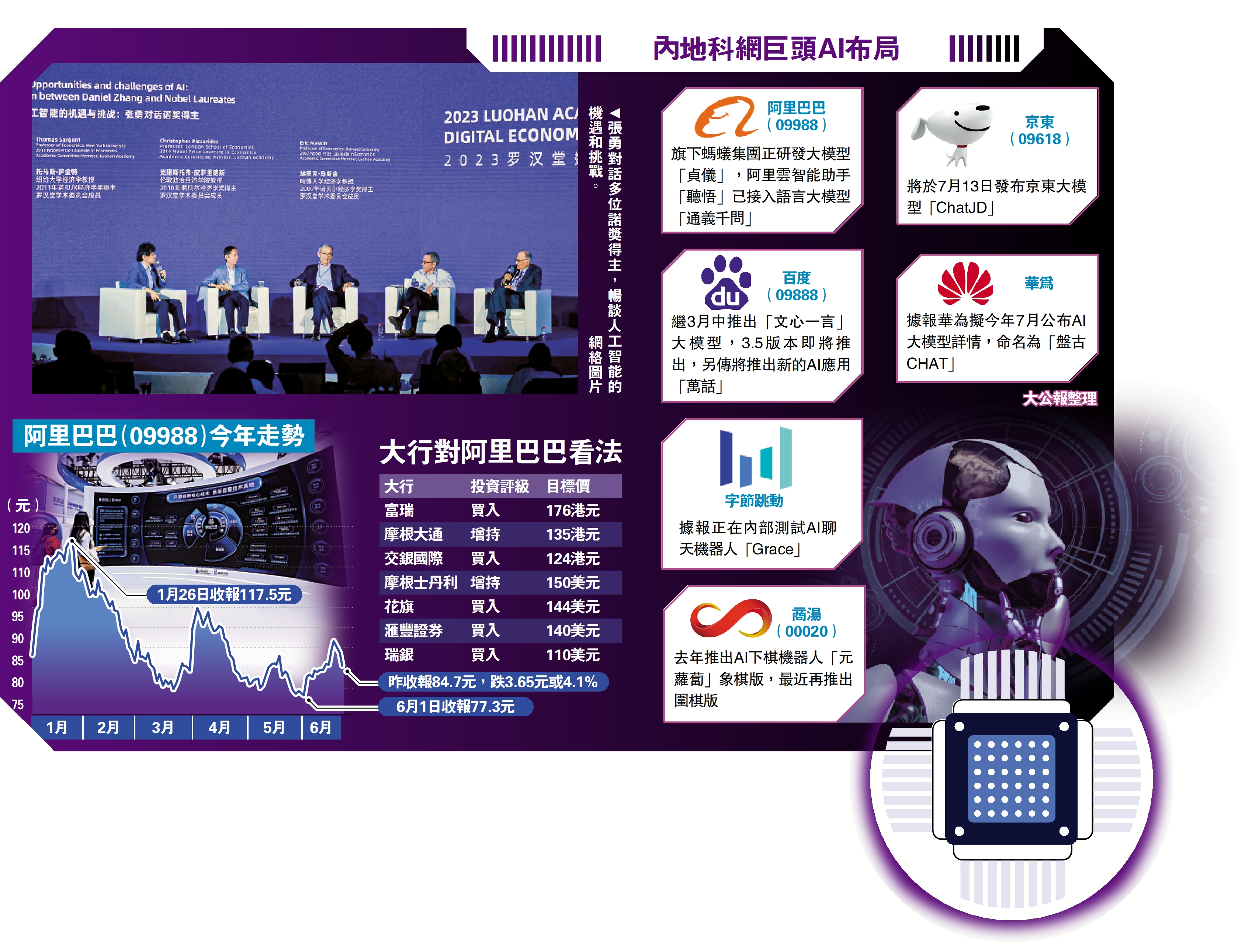 人工智能(AI)大模型成為科網企業兵家必爭之地。早前已預告年內發布大模型的京東(09618),產品將於7月13日亮相;阿里巴巴(09988)旗下螞蟻集團亦證實,正在研發語言和多模態大模型「貞儀」。市場人士相信,螞蟻財富若配合大模型能力,可提供更智能的投資諮詢、投資顧問、投資者教育等。螞蟻集團資深副總裁黃浩認為,以AI為核心的金融科技新技術,正在重塑金融服務,推動行業發展新機遇。\大公報記者 李潔儀