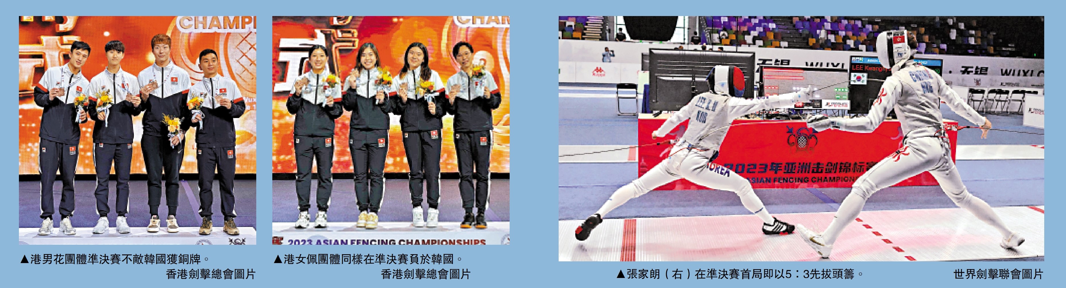 亞洲劍擊錦標賽昨(22日)在中國無錫圓滿結束,中國香港隊再添兩面銅牌。以張家朗為首的男子花劍隊於團體賽4強,以35:45連續兩屆不敵韓國取得季軍;香港女子佩劍隊則於團體賽勇挫哈薩克躋身4強,惜負於韓國同得銅牌。港劍隊最終以1金1銀6銅收官,總教練鄭兆康直言,佳績對9月杭州亞運爭牌大有幫助。\大公報記者 黃智佳