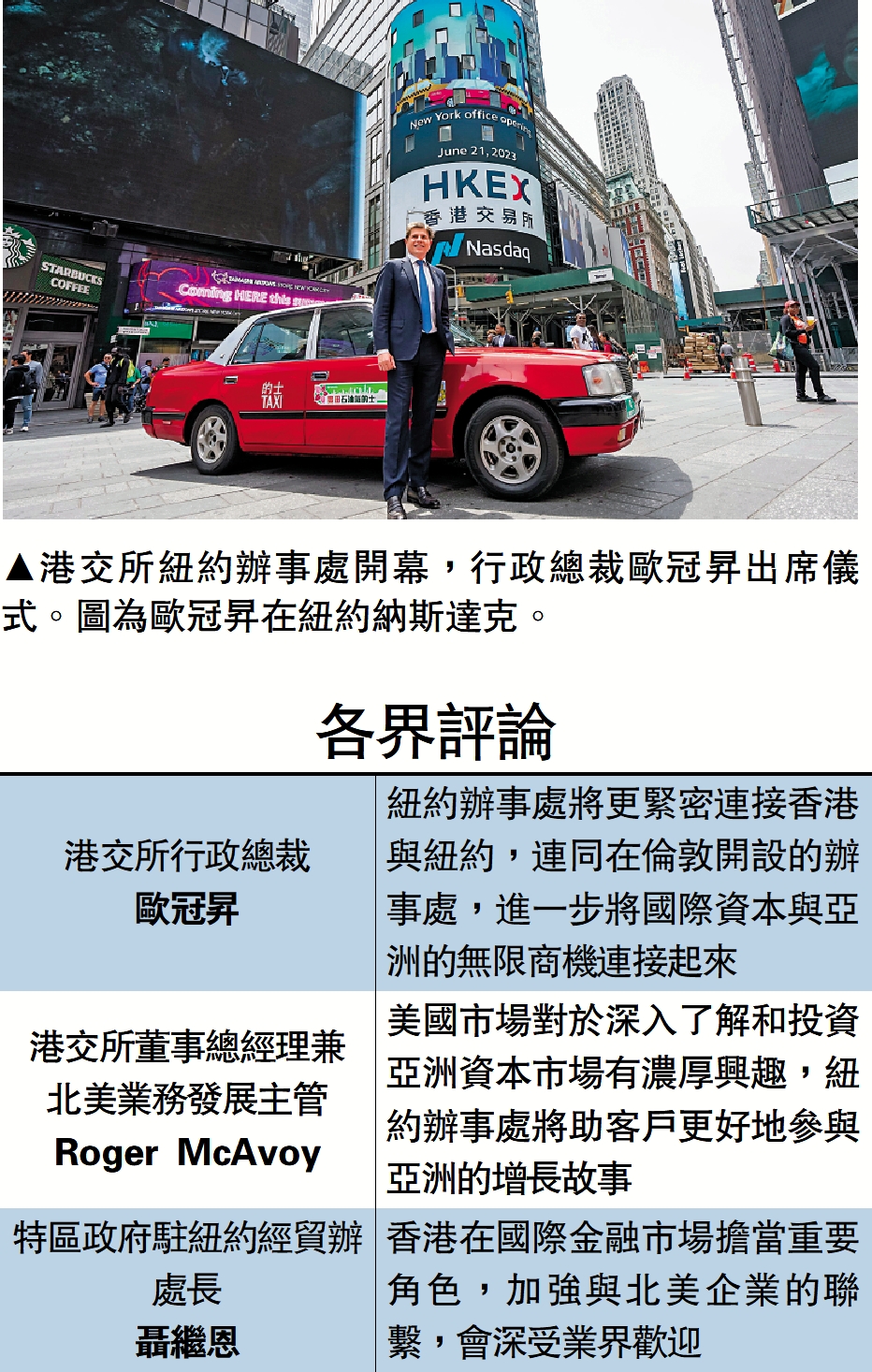 歐冠昇表示,紐約辦事處將更緊密連接香港與紐約兩個重要的國際金融中心,連同其最近在倫敦開設的辦事處,進一步將國際資本與亞洲的無限商機連接起來。港交所將繼續提高國際投資者在香港市場的參與度,鞏固香港作為東西方超級聯繫人的地位。