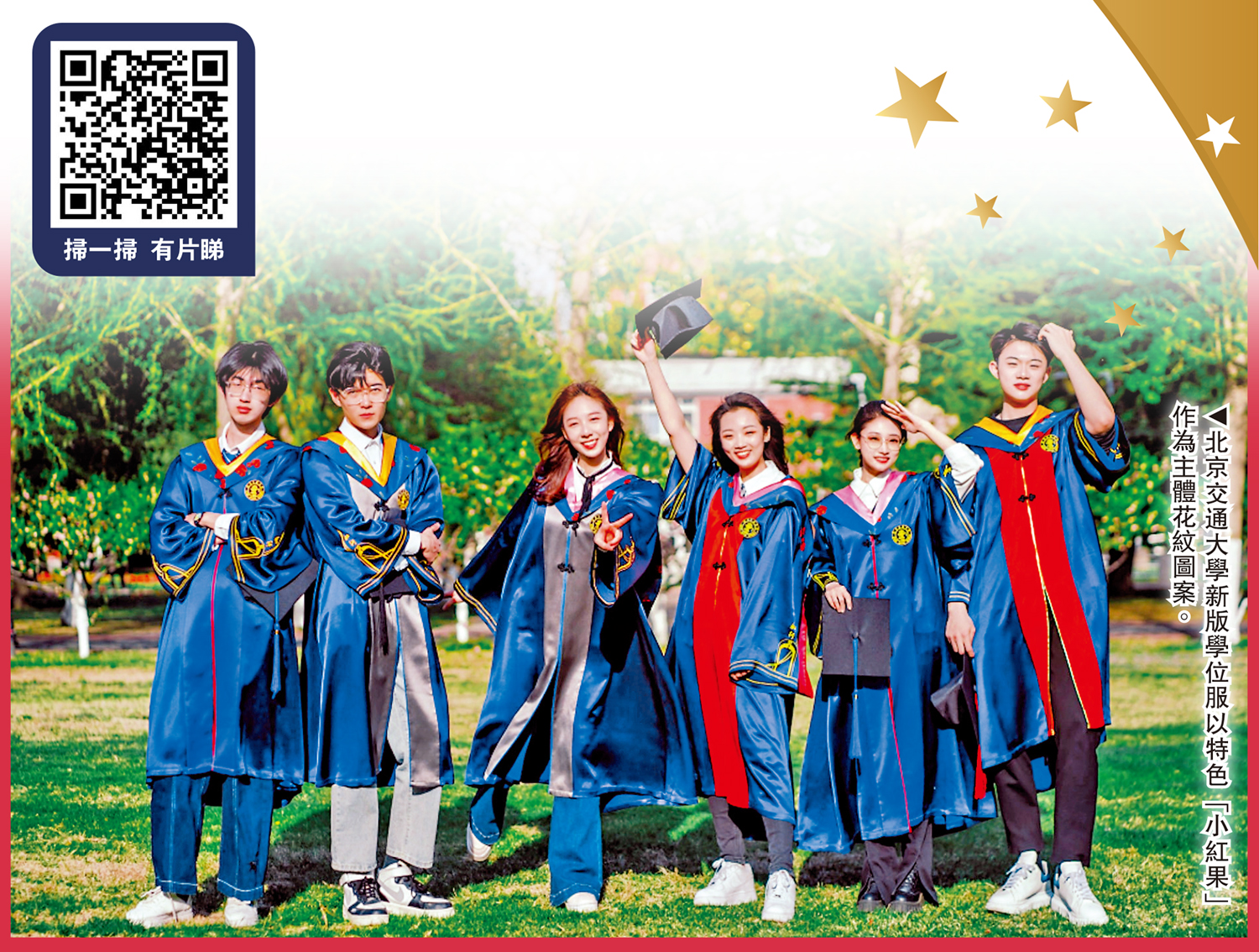 北京交通大學的新版學位服,左胸前採用金黃色線繡製學校校徽,袖口圖案設計將學校南門「知行」校訓及流動的線條相結合,象徵着畢業生們躊躇滿志地入校,如今帶着國之棟樑的期許啟程。垂布設計結合學校校園特色,以北京交大藍為底色,以該校特色「小紅果」作為主體花紋圖案,通過飾邊區分學科大類,文、工、理學科顏色分別為粉色、黃色和灰色。校方還特別提到,7月初將舉辦專場學位授予儀式,2020-2022屆未能參加畢業典禮的「小紅果們」都可申請返校,亦都有機會穿專屬學位服。有畢業生表示,學位服不只是一件衣服,更是幾年來對北京交大的記憶和感情的融合。