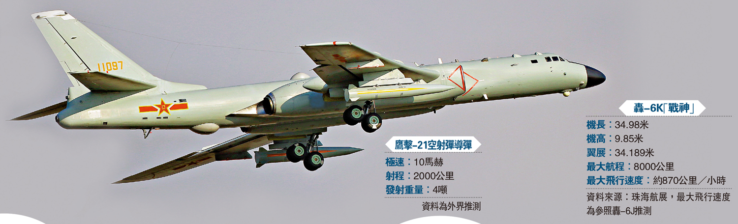 作為解放軍現役主力轟炸機,轟-6K「戰神」不斷創新戰法,拓展作戰模式。從遠程突防第一島鏈、首次夜間繞飛台島,到超低空掠海飛行驅離外艦,加之最近鷹擊-21高超音速導彈的加持,在空地打擊、反制航母等方面,發揮更大威懾。單架轟-6K可掛載兩枚鷹擊-21,在防區外對航母戰鬥群實施高精度的重火力打擊,令轟-6K真正成為戰術/戰略打擊兼備的空中作戰平台。\馬浩亮(文)