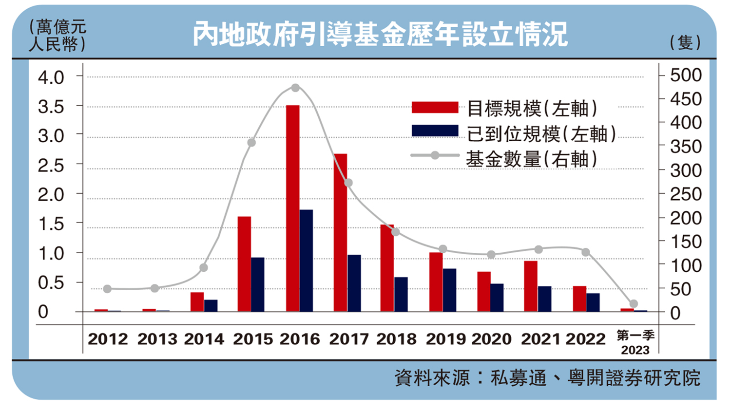 另一方面,部分觀點認為「股權財政」即發揮國有資本的引領和帶動作用,吸引社會資本參與投資具有核心競爭力的高新產業、國有資本實現保值增值,在實施資本市場有序退出後,投向下一個產業,實現良性循環。簡而言之,政府將原項目中的財政撥款補助變為投資和股權,即「撥改投」,實際地方政府已經這樣操作很多年了。進入21世紀後,政府希望解決創投企業股權融資市場失靈問題,又不希望以傳統直接財政補貼的形式耗費大量財政資金,政府引導基金模式應運而生。根據私募通數據,截至2023年一季度,中國共設立2126隻政府引導基金,目標規模12.9萬億元,已認繳規模約6.6萬億元。
