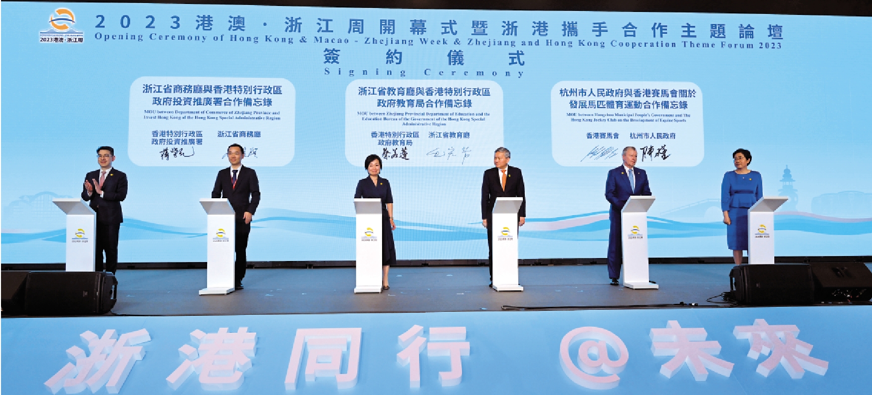 香港特別行政區行政長官李家超,浙江省委書記、省人大常委會主任易煉紅,中聯辦副主任尹宗華,外交部駐港特派員公署署理特派員潘雲東昨日出席「2023港澳·浙江周」開幕式暨浙港攜手合作主題論壇並致辭。出席論壇的浙江省嘉賓還有省委常委、寧波市委書記彭佳學;省委常委、組織部部長王成,以及活動主持、副省長盧山。至於香港嘉賓,有政務司司長陳國基、律政司司長林定國、立法會主席梁君彥、貿易發展局主席林建岳等。