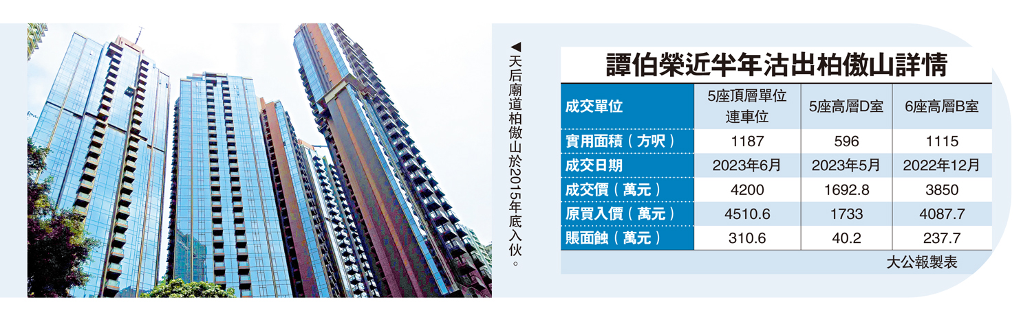 譚伯榮於2014年至2016年期間買入柏傲山多個單位,惟過去半年已先後蝕賣3伙,包括去年12月以3850萬元沽出第6座高層B室三房戶,較2014年一手買入價低237.7萬元或5.8%,扣除發展商當年現金回贈,料實蝕約310萬元;以及上月以1692.8萬元沽出第5座高層D室,較9年前入市價低逾40萬元,連同今次沽出第5座頂層單位,他半年間蝕賣3個柏傲山單位,套現近9743萬元,連雜費合共損手逾720萬元。