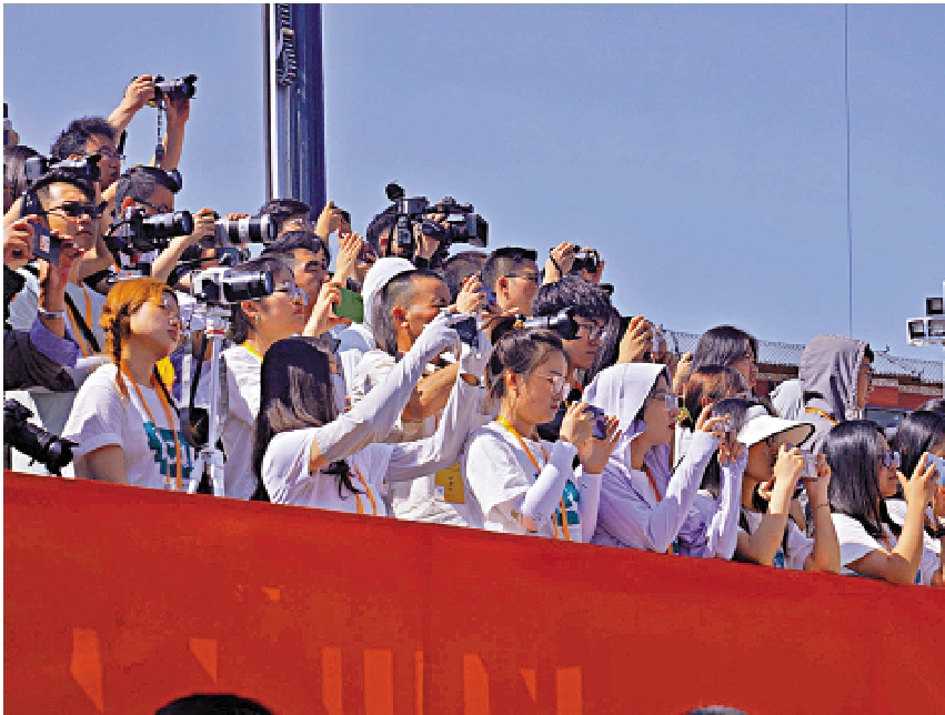 祭祀舞樂大典禮畢,參典群眾在聲聲箏曲的伴隨下,列隊前往伏羲廟獻花。《帝王世紀》記載,伏羲「作瑟三十六弦,長八尺一寸」。這是伏羲對人類音樂文化的一大歷史功績,當今以「弦」為特徵的樂器,如板胡、二胡、馬頭琴、小提琴等,均當由「瑟」演變而來。來自香港福建中學的黃倩怡同學激動地表示,第一次參加伏羲大典,自己就被音樂和舞美深深震撼。音樂曲調多變,能聽得出古箏的好多種指法撥弦。還有最後飾演羲皇與帝后的演員走上台來,兩邊揮舞着旗幟,好像走進了遠古時代。