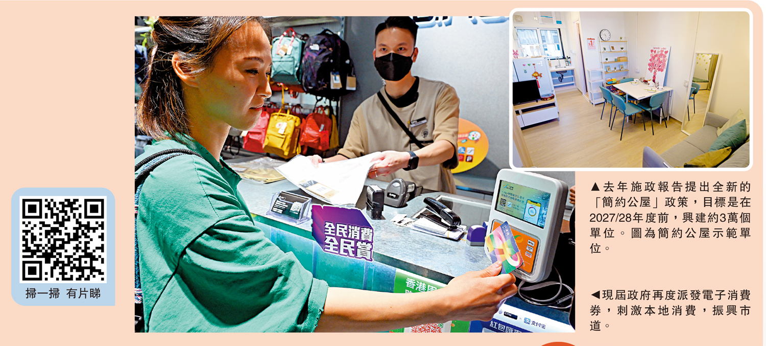 去年的施政報告提出全新的「簡約公屋」政策,目標是在2027/28年度前,興建約3萬單位。隨着8幅簡約公屋用地相繼出爐,輪候公屋人數可望加快「上樓」步伐。至於青年住屋問題,青年宿舍資助計劃今年新納入資助酒店項目,提供近400宿位。