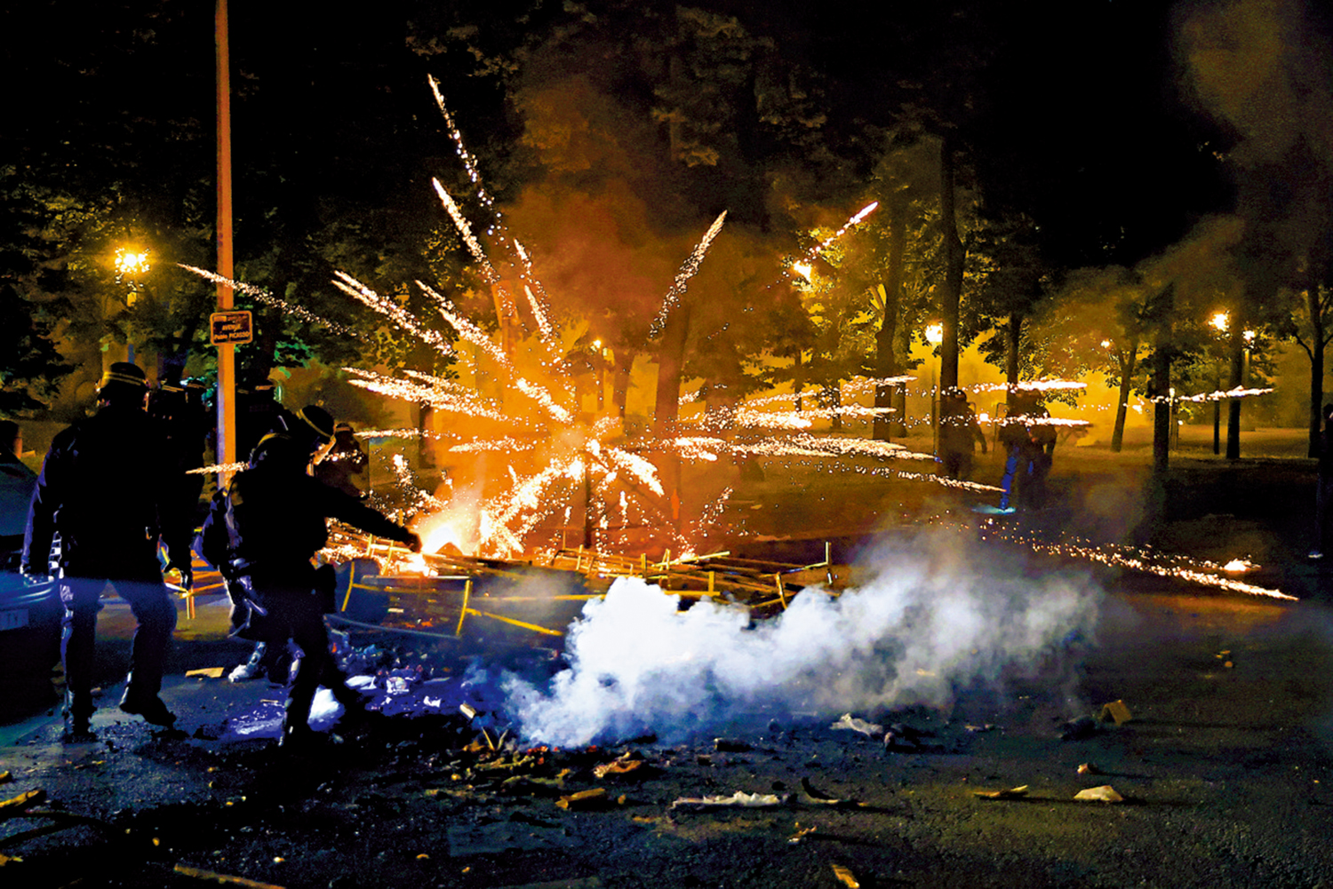 1日晚,一小群暴徒聚集在巴黎香榭麗舍大街,向警方投擲石塊。據美媒報道,數百名手持警棍和盾牌的警察負責守衛這條標誌性街道以及街道兩側的商店。半島電視台援引巴黎警方報道稱,37人因攜帶武器和違禁物品被捕。在巴黎北部的一個街區,暴徒燃放鞭炮並點燃路障,警察則用催淚瓦斯和眩暈彈回擊。內政部稱,馬賽發生了小規模衝突,但已經不像前一天晚上那麼激烈。得到增援的警察隊伍在當地逮捕了71人。