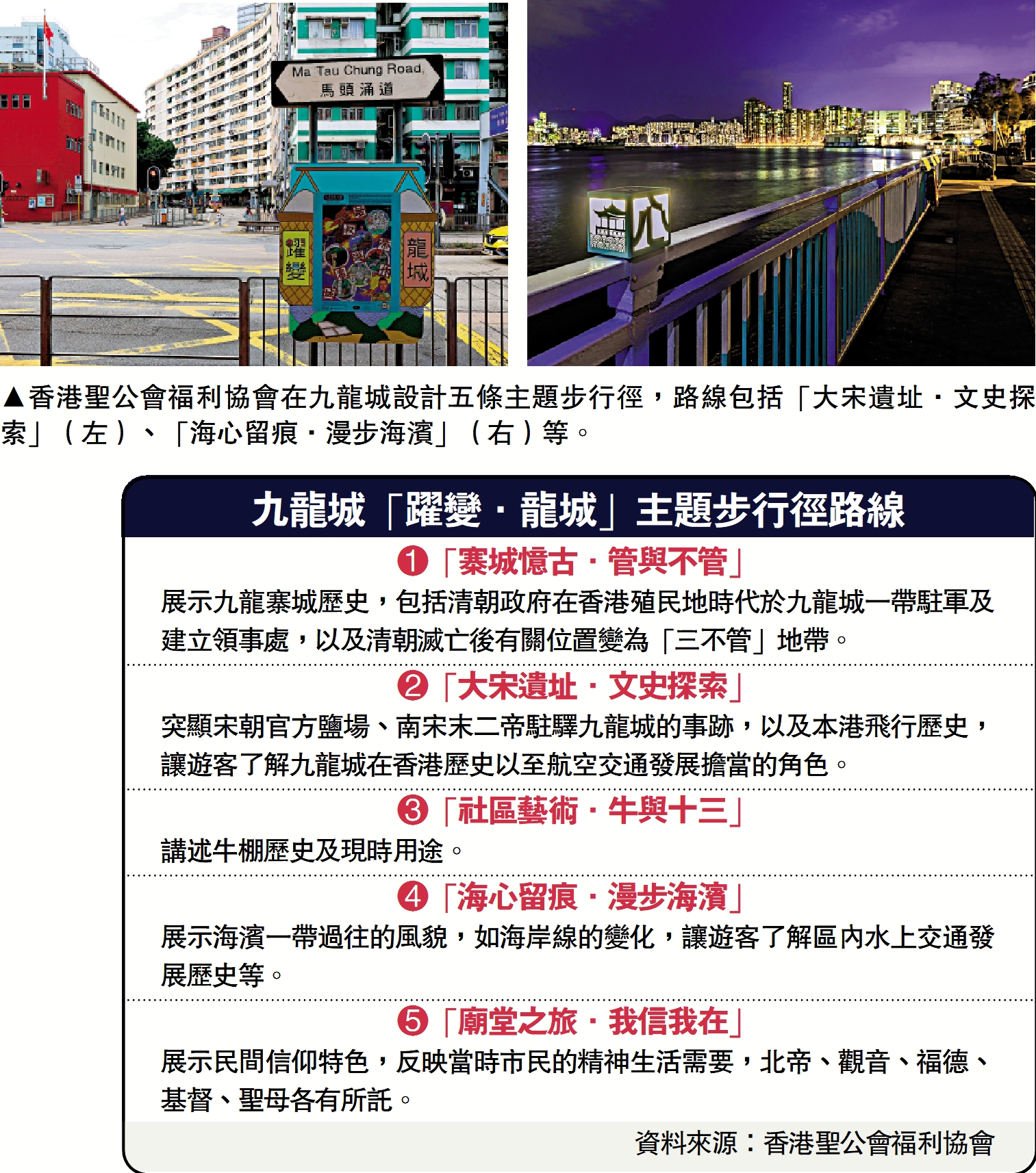 【大公報訊】記者鍾佩欣報道:九龍城區蘊藏寨城、廟堂等不同文化,傳承市民珍貴歷史的社區故事。全港最長、超過6.5公里的九龍城主題步行徑工程竣工,五個路段途經宋皇臺花園、牛棚藝術村、紅磡觀音廟等地,還有新設計的燈柱、資訊指示牌和擴增實景(AR)技術設施,向公眾介紹區內重要的歷史建築和設施。主辦單位表示,不定期舉辦導賞團,有意參與市民及旅客可於「躍變·龍城」官方網站查詢及報名。