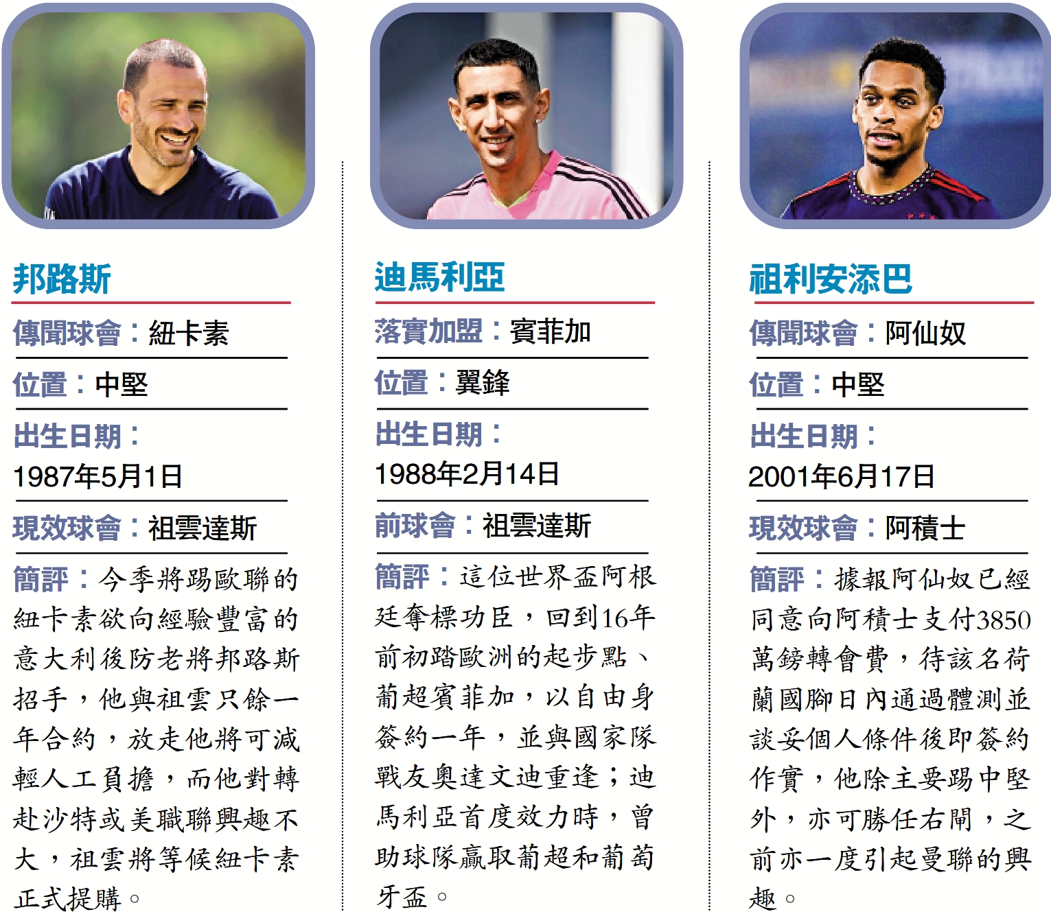 簡評:今季將踢歐聯的紐卡素欲向經驗豐富的意大利後防老將邦路斯招手,他與祖雲只餘一年合約,放走他將可減輕人工負擔,而他對轉赴沙特或美職聯興趣不大,祖雲將等候紐卡素正式提購。