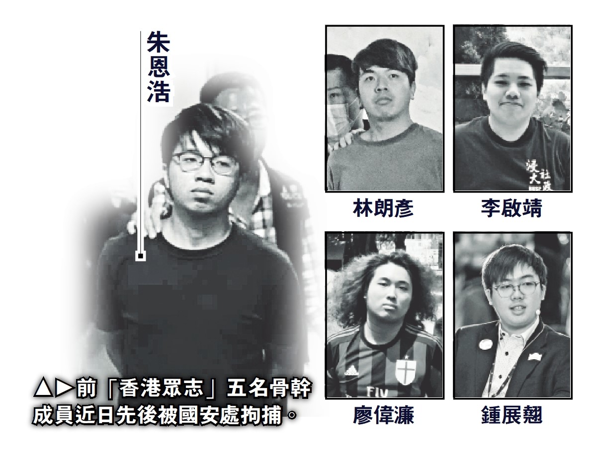 前日因涉嫌違反「串謀勾結外國或者境外勢力危害國家安全」罪及「串謀作出具煽動意圖的作為」罪被捕的前眾志主席林朗彥、成員李啟靖;以及兩名常委廖偉濂和鍾展翹。廖偉濂就讀浸會大學時期已在校內煽動反中,2018年1月他以不滿普通話豁免試的合格率過低為理由,「佔領」浸大語文中心,參與佔領的亦包括時任浸大學生會會長劉子頎及中醫系學生陳樂行,其中劉子頎更以粗口辱罵一名女英語教師,三人事後被校方紀律委員會處分,分別需停學1個學期、停學8日以及20小時「服務令」。廖偉濂等人就罰則上訴被駁回,最後須致函語文中心道歉。