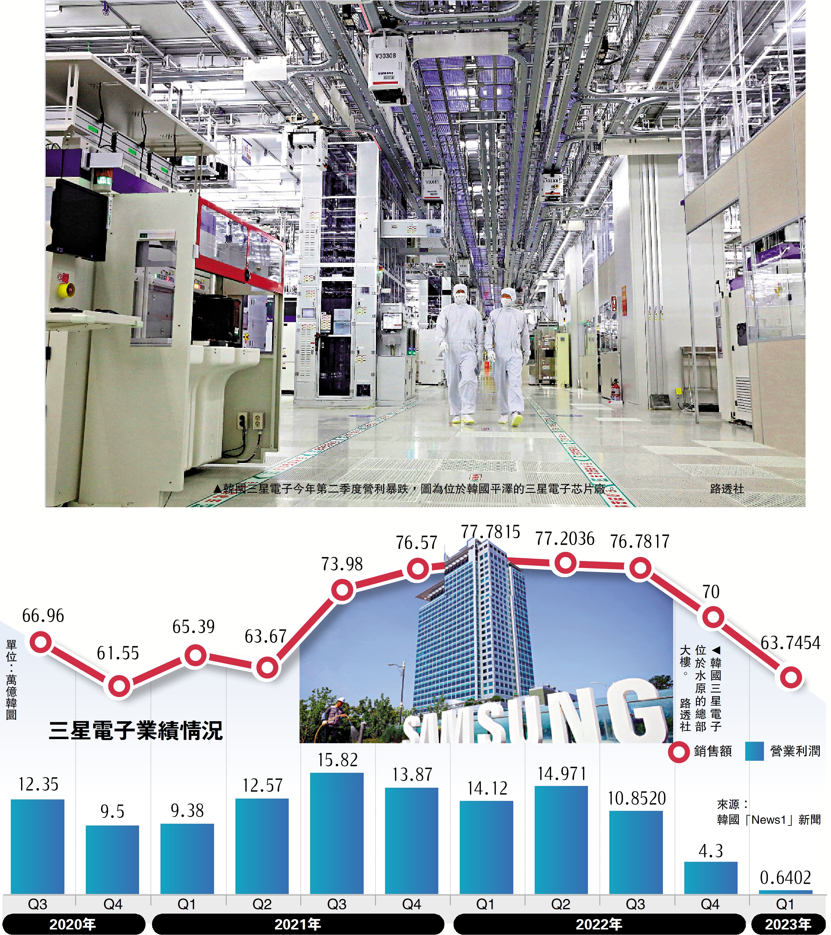 【大公報訊】綜合CNBC、路透社、《華爾街日報》報道:由於全球芯片供應過剩和需求疲軟的影響,韓國芯片龍頭企業三星電子7日公布的今年第二季度初步數據顯示,銷售額同比下降22.3%;利潤急降至6000億韓圜(約36.1億港元),同比下降95.7%,創下逾14年來的最差表現。美國去年推出芯片法案限制對華芯片投資,讓韓國相關企業進退兩難。美媒報道,三星赴美設廠其實遇到不少麻煩,尤其是水電供應問題。