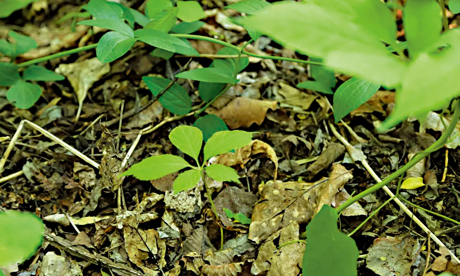 就在我對眼前的刺五加和腦子裏山參的幻象糾纏不清之際,二哥在前面朗聲叫道:「巴掌!」我一愣,急忙趕去,終於在二哥的山鋤前山林中見到夢寐已久的「真身」:這根兩年參齡的山參莖上長着五片紡錘形的淡綠色葉子,猶如人手上的五個手指,本地人俗稱為「巴掌」。我興奮地在參苗前仔細端詳了好一會兒,二哥卻略帶愧意,「這苗太小了,還是留下吧。今天咱要是找不到更大的,再把它帶走。」見我不知所措地呆立,他二話不說,順手撿過幾棵乾樹枝,護在參苗周邊,全然不顧我對這根小參苗的不捨之情。