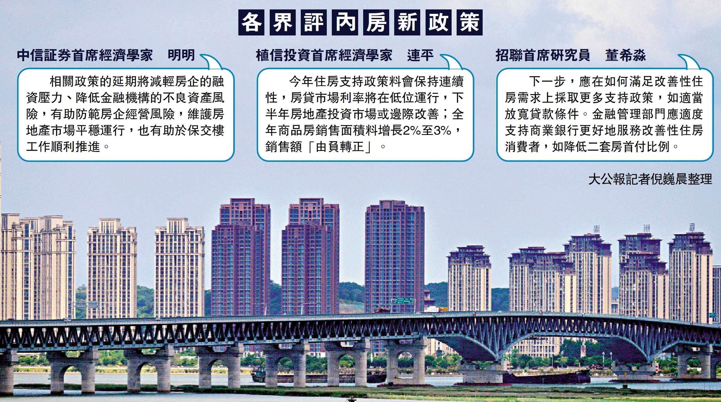 中國人民銀行、國家金融監督管理總局昨日發布延長關於金融支持房地產市場平穩健康發展有關政策期限的通知。《通知》表示,考慮房地產市場形勢,為引導金融機構繼續對房地產企業存量融資展期,加大保交樓金融支持,決定延長有關政策適用期限至2024年12月31日,其他不涉及適用期限的政策長期有效。業界認為,《通知》進一步改善房企融資,穩定市場信心,推動房地產平穩健康發展。\大公報記者 倪巍晨
