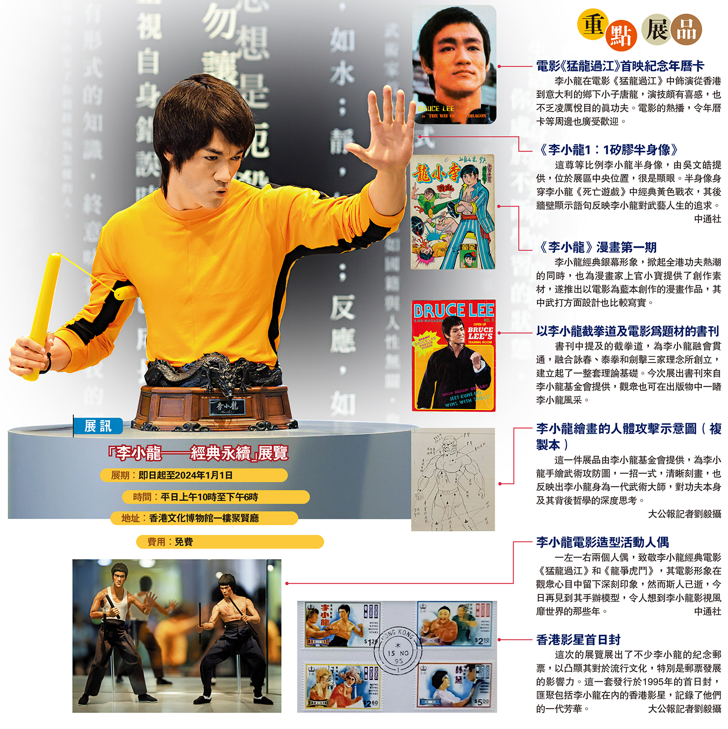 為紀念一代傳奇巨星李小龍逝世50周年,香港文化博物館今日(12日)起舉辦「李小龍——經典永續」展覽,展出一系列以李小龍為題的流行文化珍藏,包括書刊、紀念郵票、手辦模型等,同時將舉辦一連五日的「香港李小龍日營」主題活動以及《細路祥》電影放映及映後談等,引領觀眾重溫一代武打巨星風采。\大公報記者 劉 毅