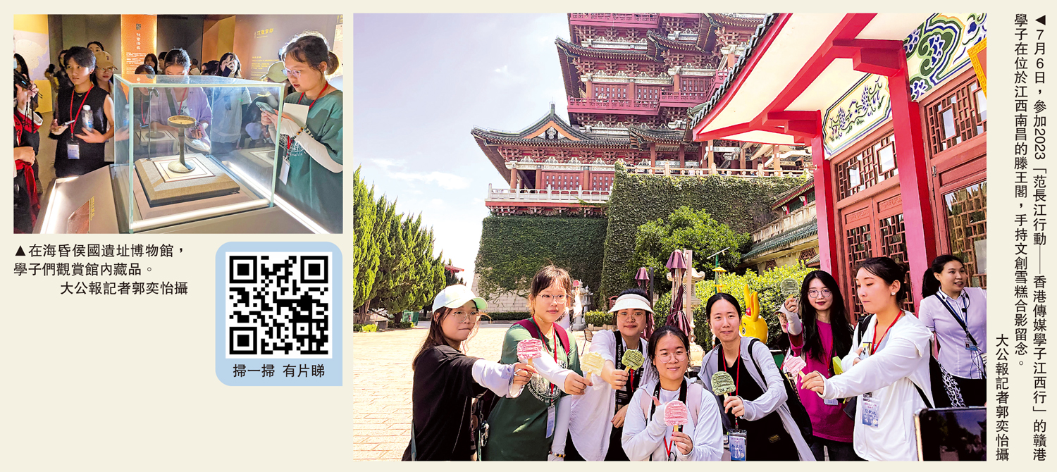 7月6日,2023「范長江行動──香港傳媒學子江西行」採訪團前往南昌漢代海昏侯國國家考古遺址公園,參觀遺址博物館區,深入了解漢代鼎盛時期的璀璨文化。為了讓遊客擁有「身臨其境」的沉浸式觀展體驗,海昏侯國遺址博物館根據漢代歷史資料的記載和考古挖掘發現,用人物蠟像和沙盤模型直觀地展現出海昏侯墓建造的不易;充分運用新型數字技術,打破時空阻隔,全方位展示文物及其背後的文化故事。據介紹,遺址二期開發將會融入VR技術,遊客可帶上VR眼鏡,在虛擬環境「穿越時空」般切身感受「黃金大墓」墓區細節。\大公報記者葉婷、張依林南昌報道