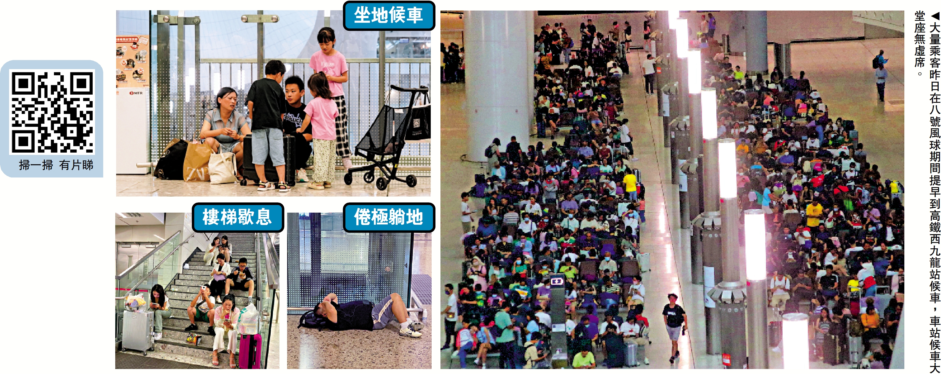 高鐵香港段維持正常運作,高鐵西九龍站高峰期一半候車乘客無位坐,只能席地而坐,亦有人坐在樓梯間,靠牆或坐在行李箱上。港鐵指留意到有乘客因颱風關係提早出發到西九龍站,由於最早的入閘時間為列車開出前120分鐘,早到的乘客需要稍候,如有需要會加派人手協助乘客。\大公報記者 葉浩源、楊州、調查組(文) 調查組、林良堅、突發組(圖)