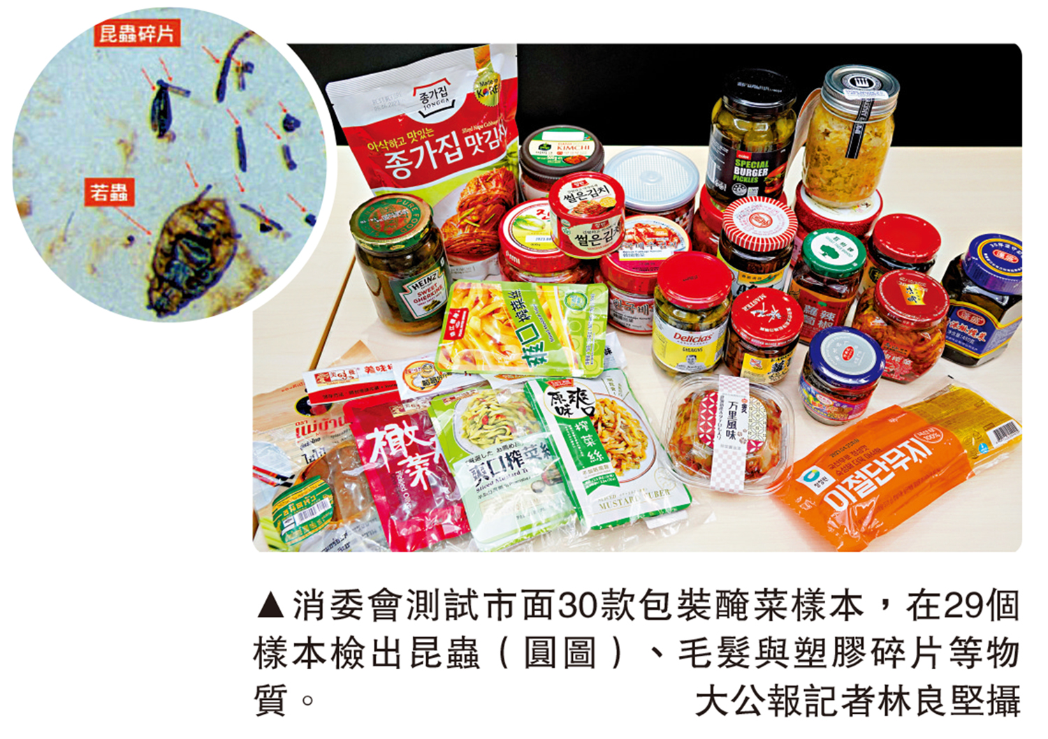 醃菜,泡菜、酸菜和榨菜等是佐粥送飯佳品。不過,消委會測試30款預先包裝醃菜樣本發現,絕大部分樣本含昆蟲及毛髮等物質,其中「美味棧」、「坤興記」、「綿香」等三款橄欖菜樣本,含約90至310塊昆蟲碎片,食安中心正在跟進。