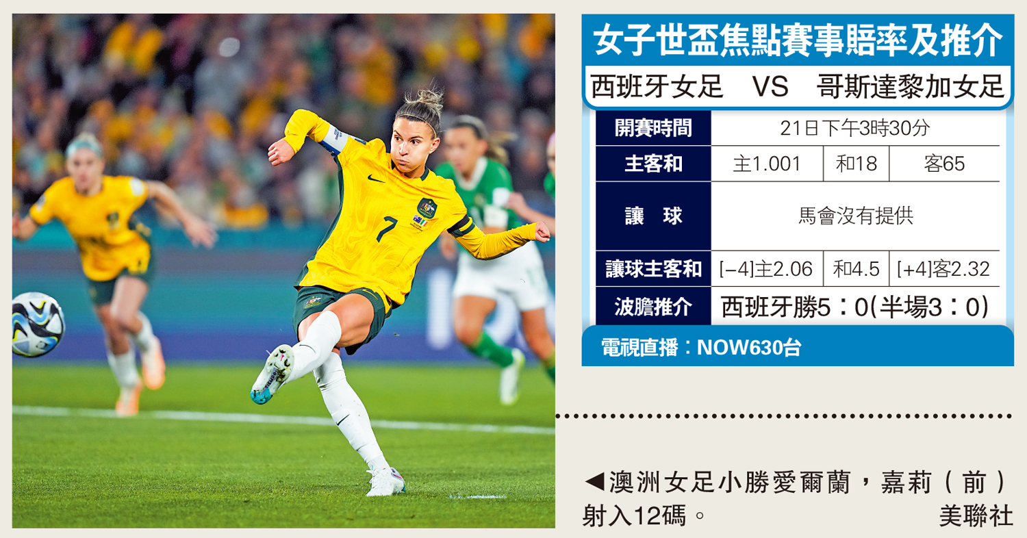 【大公報訊】綜合ESPN FC、香港賽馬會足智彩報道:女子世界盃今午繼續開賽,由C組的西班牙女足與哥斯達黎加女足對撼,世界排名第6的西班牙是今屆奪冠大熱之一,與36位的哥斯達黎加可說是強弱懸殊,西班牙有不少大勝經驗,今仗或會以哥斯達黎加「祭旗」。讓球主客和西班牙女足[-4]可下注「讓主」圖利。(NOW630台今天下午3時30分直播)