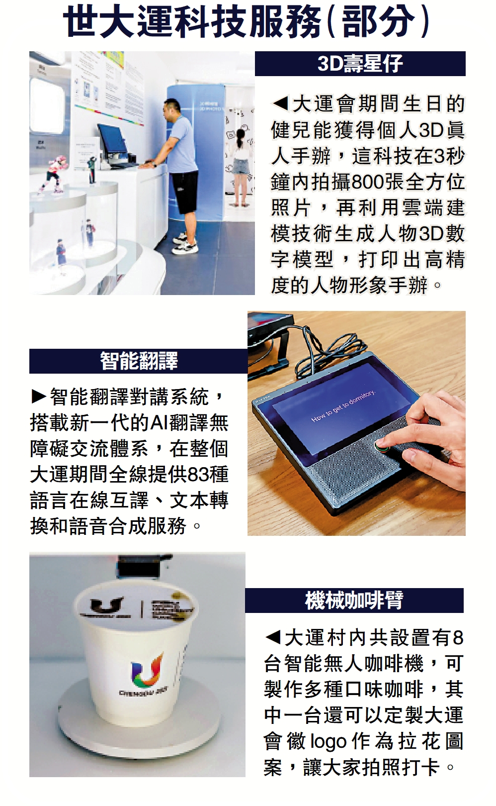 大運會期間生日的健兒能獲得個人3D真人手辦,這科技在3秒鐘內拍攝800張全方位照片,再利用雲端建模技術生成人物3D數字模型,打印出高精度的人物形象手辦。