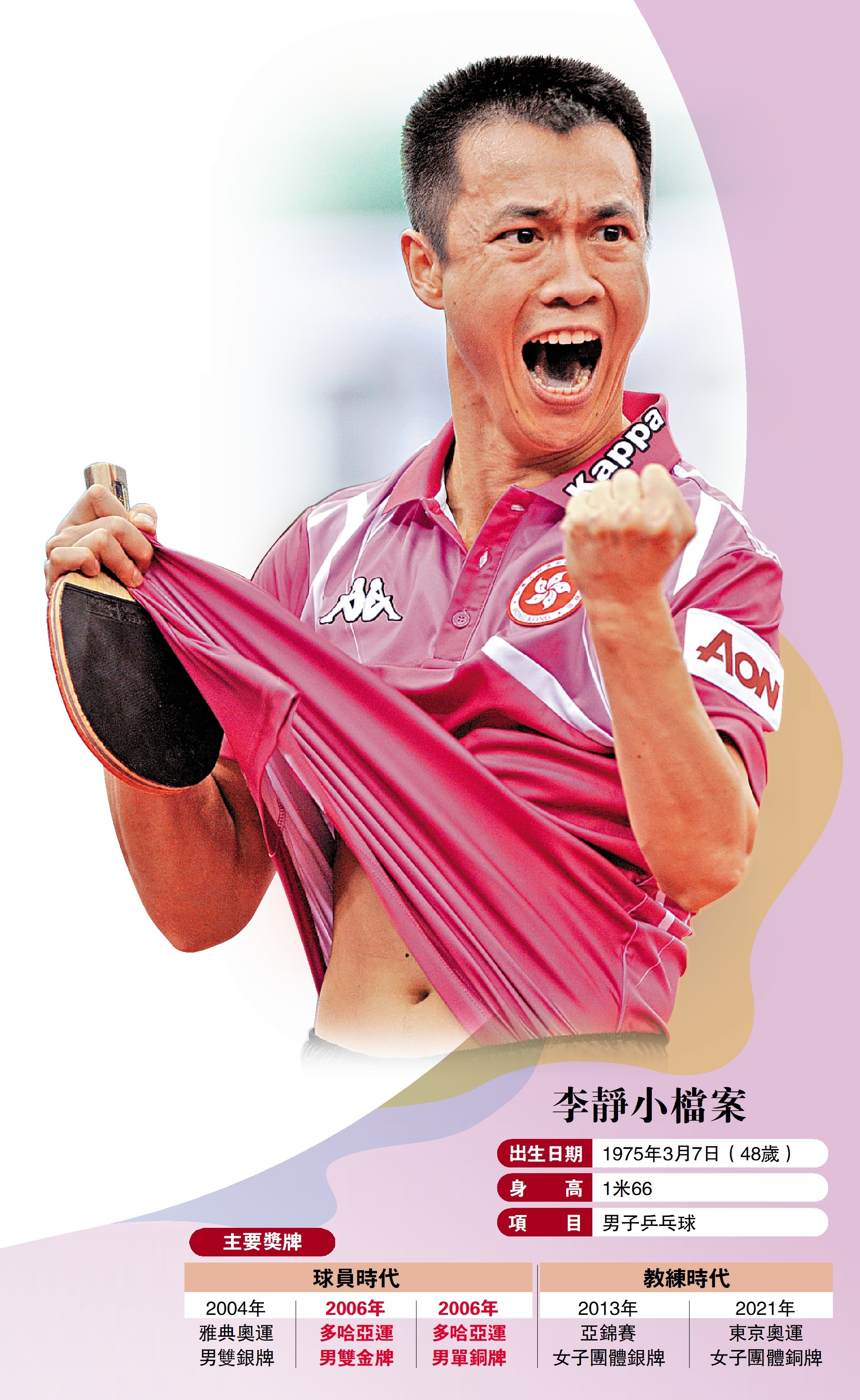 中國香港乒乓女隊主教練李靜,自小已獲選入中國國家隊,及後在1999年以體育專才身份來港發展,高光時刻是與高禮澤勇奪2004雅典奧運男雙銀牌及2006多哈亞運男雙金牌。轉任教練後的李靜同樣成功,代表作為帶隊在2021東京奧運奪得女團銅牌。由於受訪時時常爆出金句,李靜又被譽為「金句王」,他最近更推出自傳,希望以個人半生回憶錄,鼓勵遇到挫折的年輕人要逆境前進,走向成功。\大公報記者 黃智佳