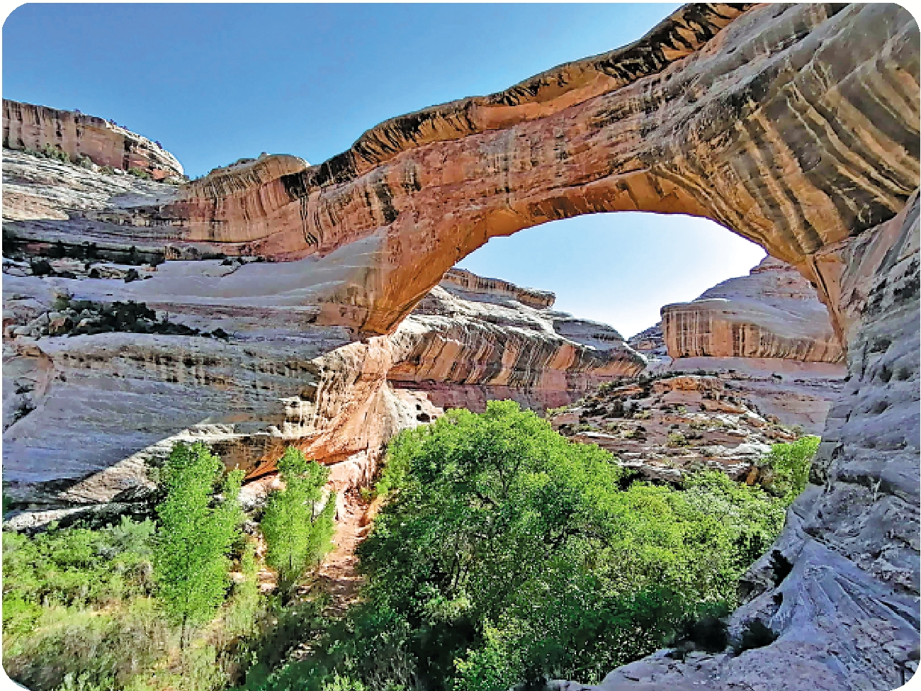 拱形,弧形,圓形,都是優美的形狀。「雨霽虹橋晚,花落鳳台春」,「雙橋落彩虹」,很多人造橋的孔洞就是拱形或圓形。唐詩的意境裏,分不出究竟是虹,是弧,還是兼而有之?在猶他州東南的天然石橋國立保護區(Natural Bridges National Monument),若能不辭辛勞,下到谷底,再徒步行至三座天然石橋之下,即可與它們古老而沉重的身軀靜靜相對。三座石橋像從巨人厚壯的胸肌和肩胛延伸出的手臂,二頭肌、三頭肌左右墳起,其中Sipapu高六十七米,厚十六米,跨度約八十二米,為世界第二大天然石橋。三座石橋中據推測最年輕的是Kachina,厚達二十八米。這些巨岩堆出的史前冥頑,俯視我這不足六英尺的速朽有機體,不知作何感想?