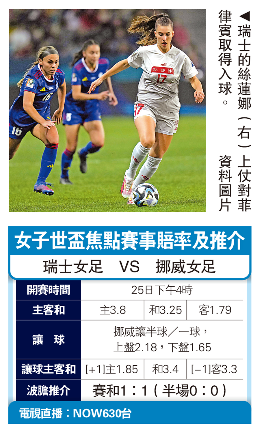 【大公報訊】綜合國際足聯官網、香港賽馬會足智彩報道:女子世界盃今天展開次輪分組賽,其中A組在揭幕戰不敵東道主新西蘭的前冠軍挪威,將與瑞士背水一戰,雖然許勝不許敗,但首戰所見挪威表現平平,實無可勝本錢,宜捧「讓球」受讓半/一瑞士下盤。(NOW630台今午4時直播)