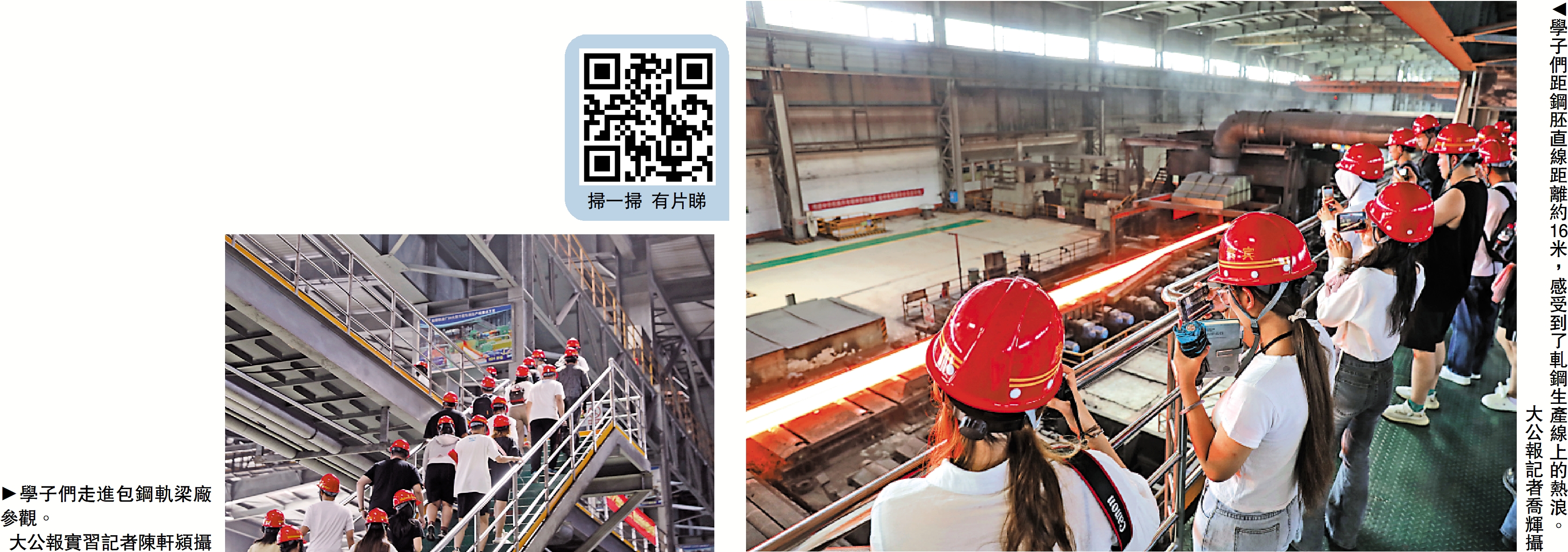 參加2023年范長江行動內蒙古行的香港傳媒學子們走進包鋼軌梁廠,火紅的條形鋼胚在千米長的萬能軋鋼生產線上,反覆軋製,一股熱浪迎面而來,軋機轟鳴,吸引着到訪包鋼軌梁廠的學子駐足觀看。包鋼軌梁廠安全監理富鵬介紹,學子所處的位置距鋼胚直線距離約16米,體感溫度接近40度,鋼胚實際溫度約1350度。「過去工人需要腳踩特製木鞋、身穿石棉服在旁操作機器軋鋼,每天在『桑拿房』工作8小時。」