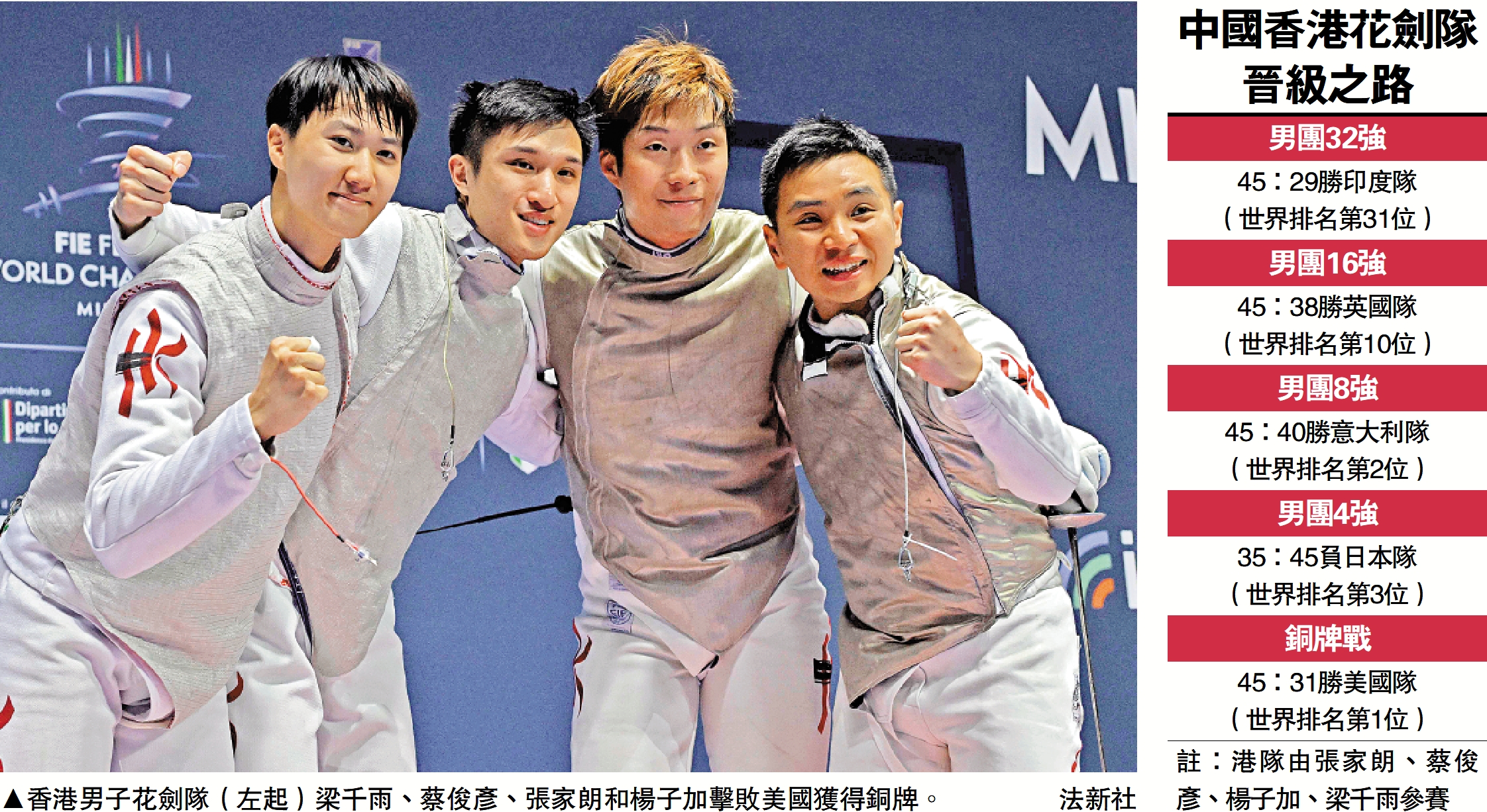 【大公報訊】中國香港男子花劍隊,昨天在意大利米蘭舉行的劍擊世錦賽,參加花劍團體賽事。這支由張家朗、蔡俊彥、楊子加及梁千雨組成的花劍隊伍,在八強勇挫實力強勁的意大利隊,可惜他們於四強力戰下,以35:45不敵日本隊,港隊其後與美國隊爭奪銅牌,在張家朗、蔡俊彥、梁千雨有出色表現之下,港隊以45:31取勝,歷史性奪得銅牌。