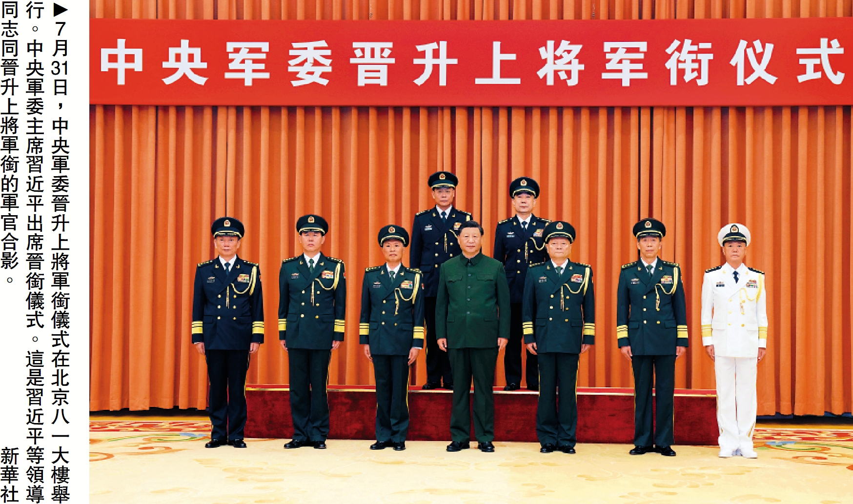 【大公報訊】據新華社報道:中央軍委晉升上將軍銜儀式7月31日在北京八一大樓舉行。中央軍委主席習近平出席晉銜儀式。上午10時許,晉銜儀式在莊嚴的國歌聲中開始。中央軍委副主席張又俠宣讀了中央軍委主席習近平簽署的晉升上將軍銜命令。中央軍委副主席何衛東主持晉銜儀式。