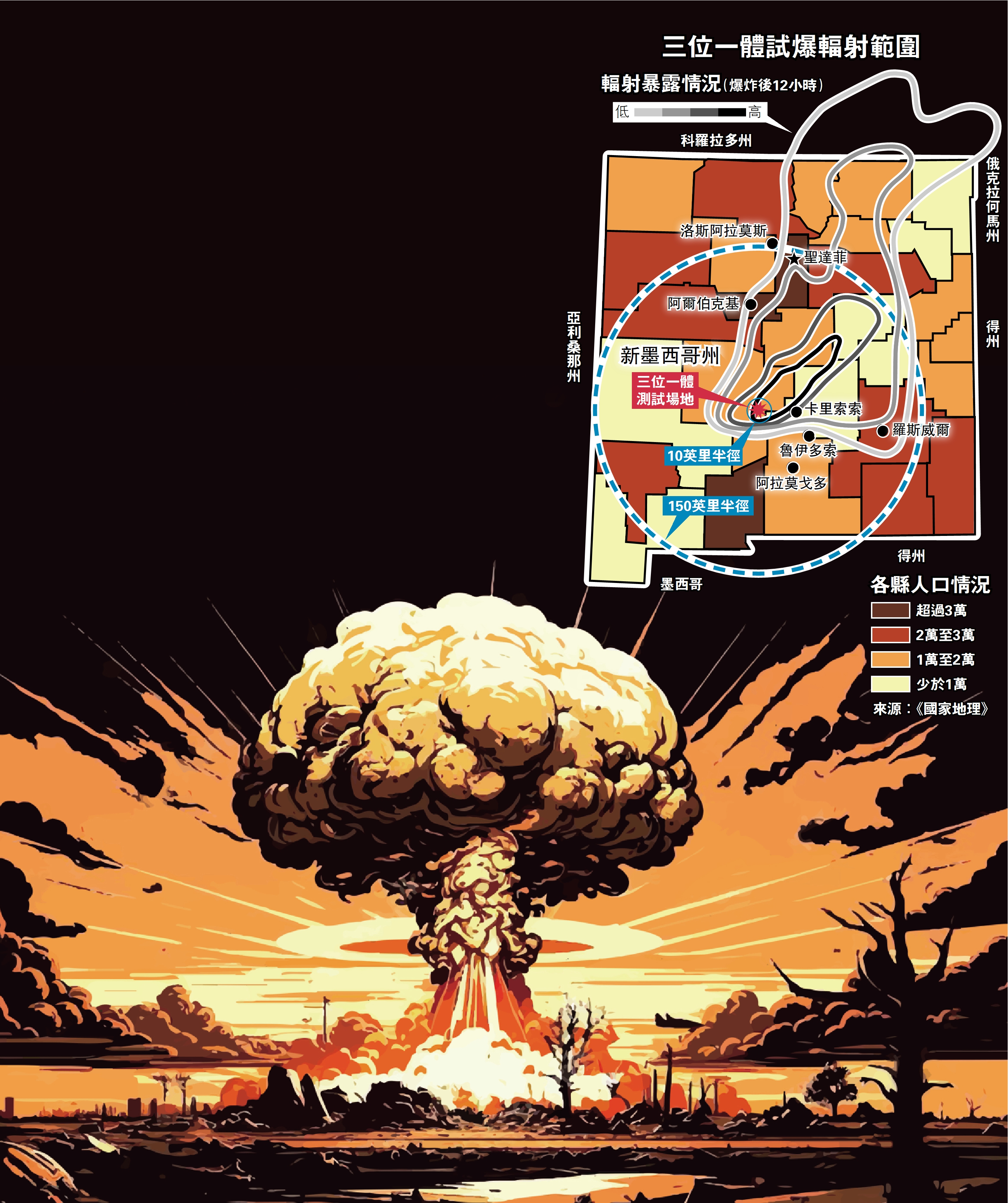 1945年7月16日,在奧本海默的帶領下,科學家們在新墨西哥州洛斯阿拉莫斯以南的沙漠上空,引爆了昵稱為「小工具」的原子彈。這顆原子彈的爆炸當量高達2萬噸以上,威力約為廣島原爆的1.5倍,爆炸產生的放射性塵埃向東北擴散,覆蓋了約250英里、寬約200英里的區域。
