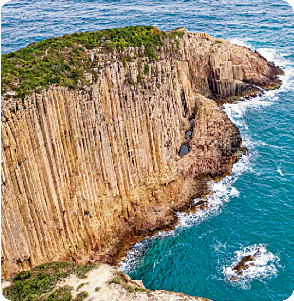六角石柱組成一座山佇立於海邊,大自然無意而為,卻充滿了意趣。如一本本龐然的書庫,一冊一冊,藏着大千世界探究不盡的神奇故事。像一片石狀竹林,根根向上。也像一部大大的豎琴,根根石弦錚錚有聲,還有的扭曲如風中蘆葦,嫋娜着身姿。於是,石頭有了韻律、有了節奏,有了立地沖天的升騰感。