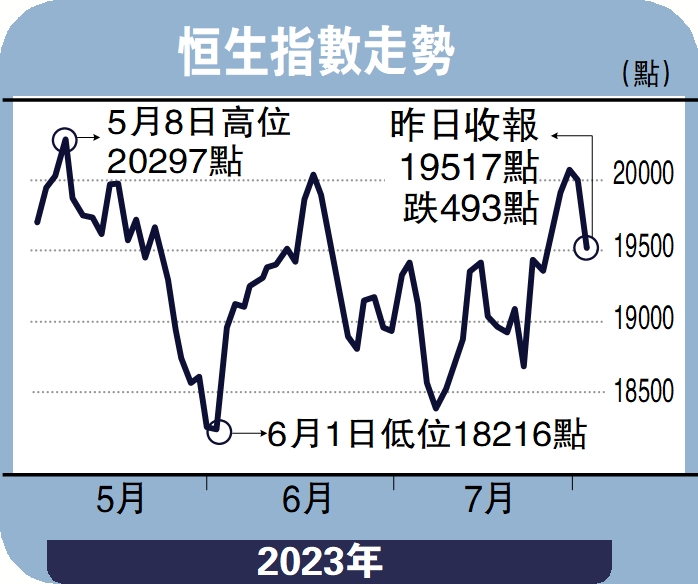 港股昨日急劇震盪下行,最低時恒指報19475點,重挫536點(跌幅2.67%),其後略作反彈,但因棄守20000點關引發小型「恐慌性拋售」,好友靜候大市如何演變。收市恒指報19517點,跌493點(跌幅2.47%)。全日總成交1134億元,較上日少217億元。