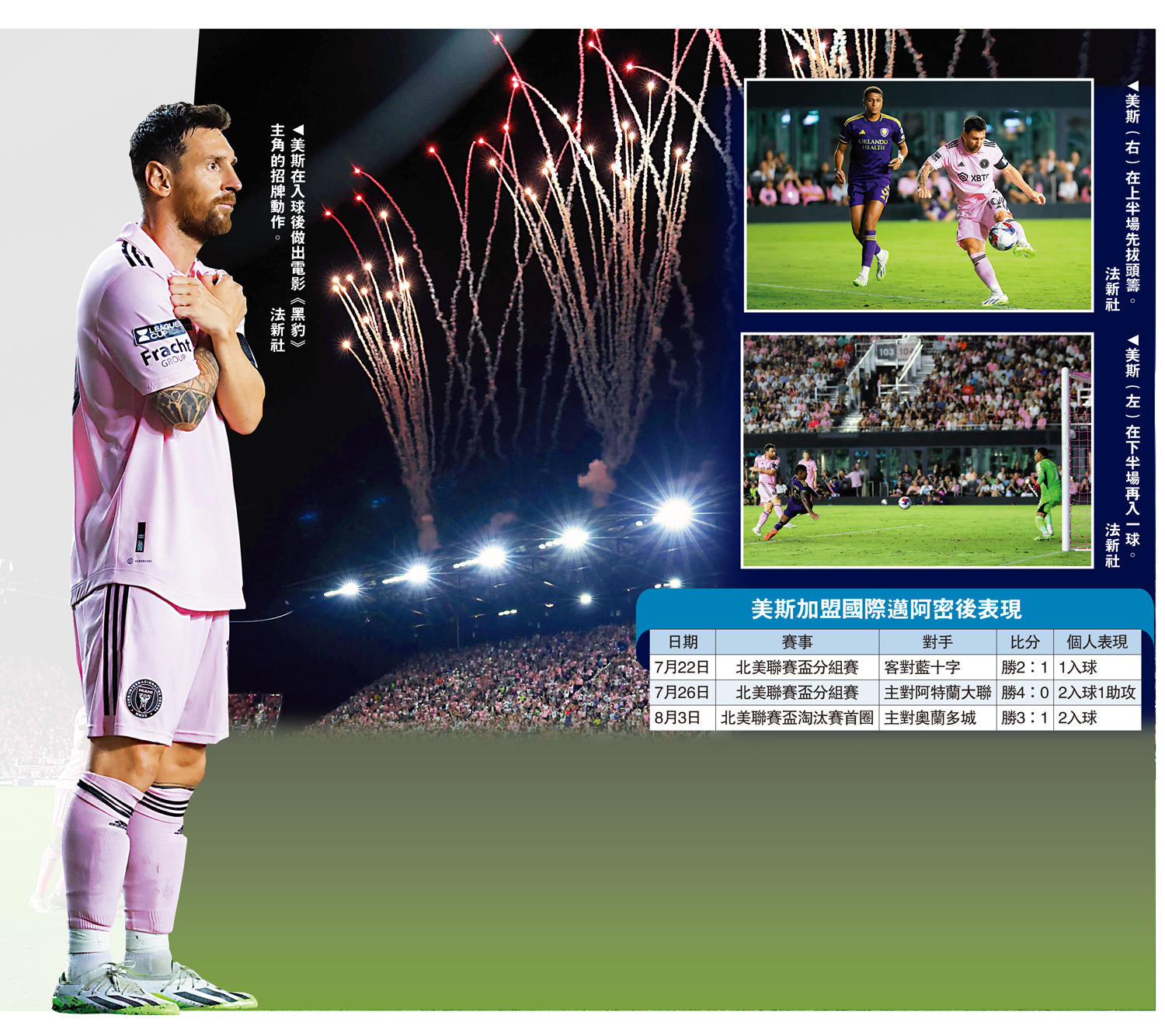 阿根廷球王美斯登陸美職入球停不了,他於周四帶領國際邁阿密,出戰主場對奧蘭多城的北美聯賽盃淘汰賽首圈賽事,甫開賽便以刁鑽走位切入禁區左腳凌空抽射先開紀錄,半場奧蘭多城追成1:1,美斯於下半場讓出12碼予隊友祖斯夫馬天尼斯射成2:1,之後美斯以右腳凌空抽射破網成3:1完場,邁阿密昂然晉級16強。美斯加盟後一直帶隊出戰北美聯賽盃,至今不僅連贏3場,助球隊成績「大翻身」,他個人更在3場比賽射入5球,有意助球隊爭奪冠軍。\大公報記者 梁潤森