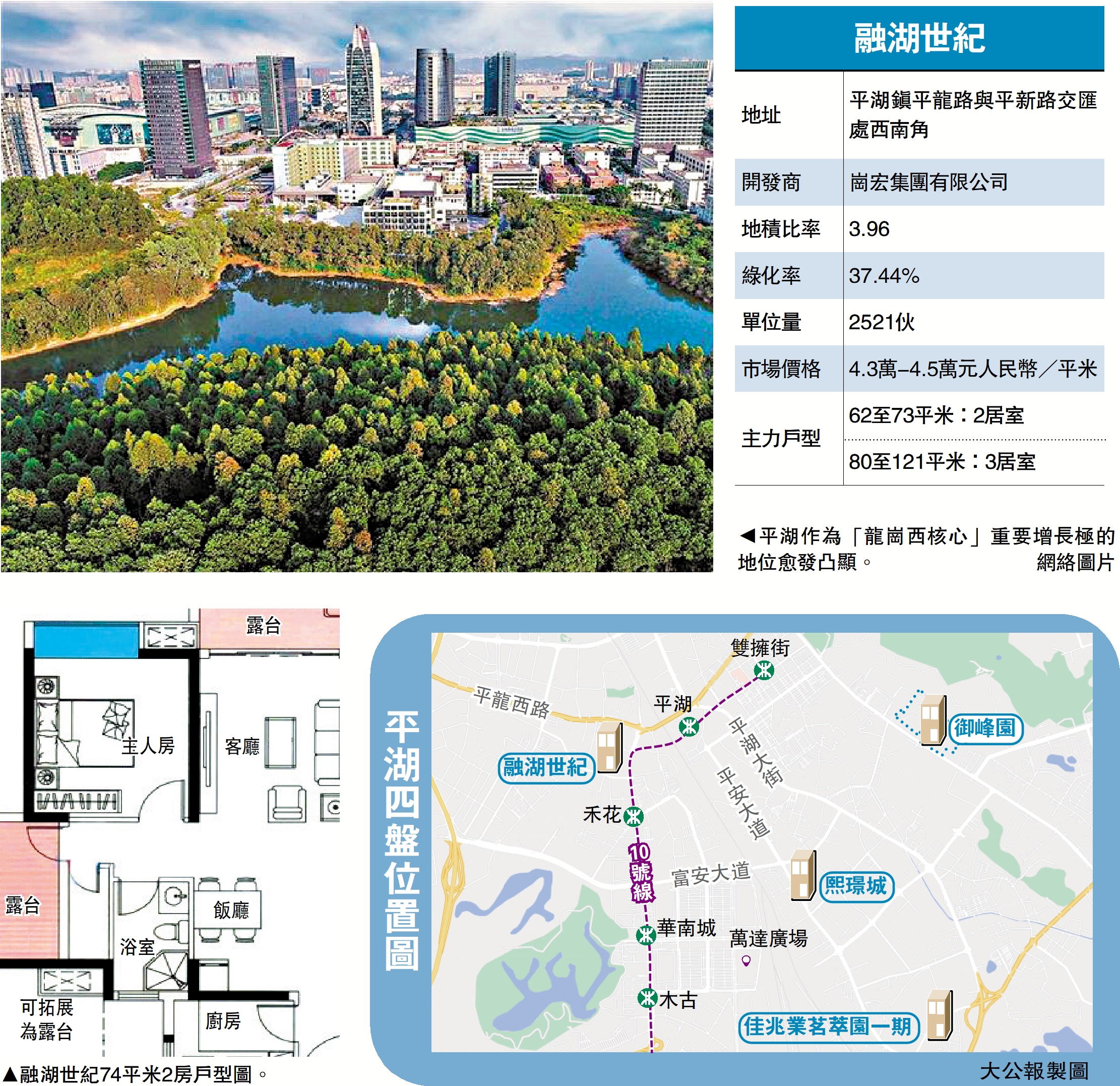 深圳市正在規劃將平湖站打造成綜合交通樞紐,規劃集鐵路、城際、城市軌道於一體。目前,廣深城際鐵路已拉近平湖與香港的時空距離,港人從羅湖深圳火車站乘坐和諧號列車,僅13分鐘直達平湖站。透過地鐵10號線和規劃建設的地鐵17號線,可分別從福田口岸和羅湖口岸直達平湖。交通便捷性及較高性價比的物業,吸引港人到區內置業實現融入大灣區夢想。其中,區內次新盤融湖世紀兩房入手價240多萬人民幣(約260萬港元),為福田多數樓盤價格的一半,港人灣區購房上車壓力較小。\大公報記者 李昌鴻