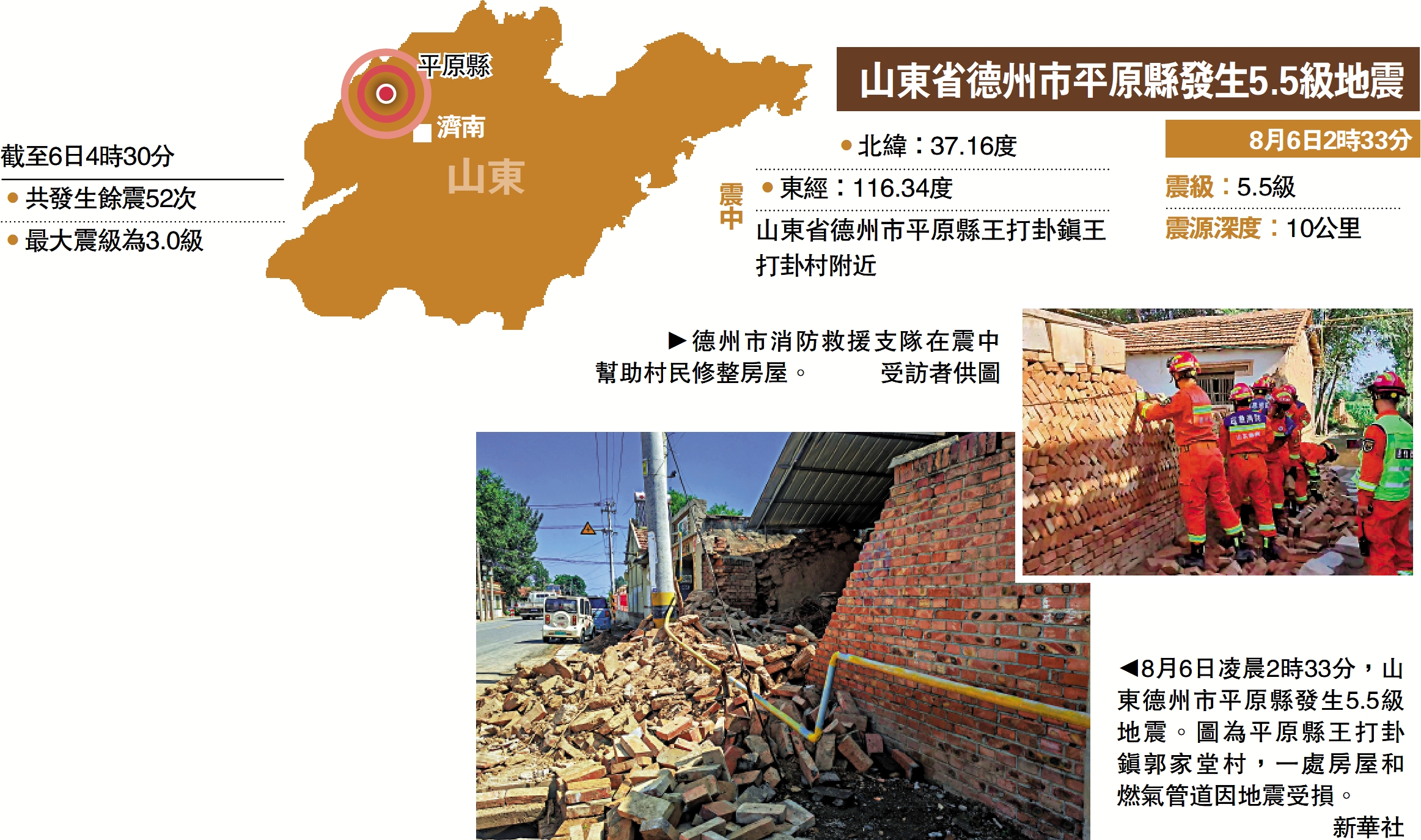 【大公報訊】綜合記者丁春麗、張帥報道:6日2時33分,山東德州市平原縣發生5.5級地震,震中為平原縣王打卦鎮(北緯37.16度,東經116.34度)。據央視新聞消息,截至6日17時,共造成24人輕傷(德州23人、聊城1人),213處(德州165處、聊城48處)房屋及牆體受損,震區水、電、通信等基礎設施正常。