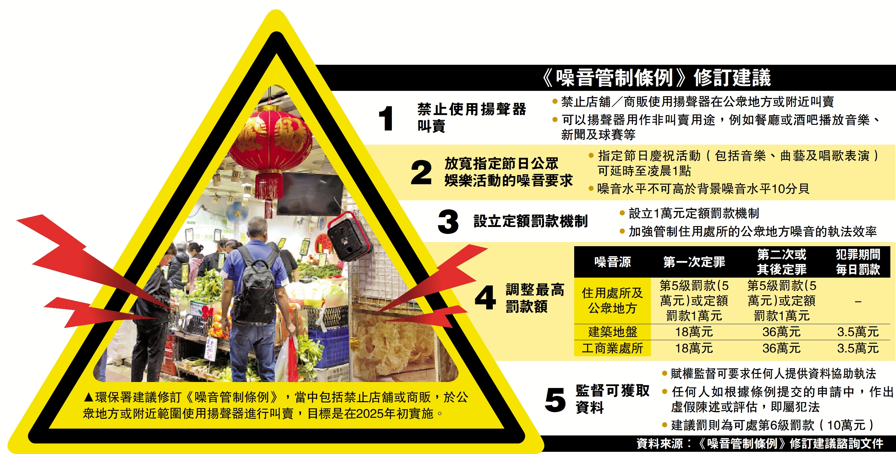 噪音問題困擾不少市民,環境保護署建議修訂《噪音管制條例》,包括禁止店舖或商販,於公眾地方或附近範圍使用揚聲器進行叫賣,又計劃就來自住用處所和公眾地方的噪音問題,引入定額一萬元的罰款機制。修訂亦建議放寬在公眾地方慶祝節日時的噪音規限,容許在中秋節、萬聖節、平安夜、除夕等十個節日,由慶祝活動產生的噪音可延長至翌日凌晨一時。