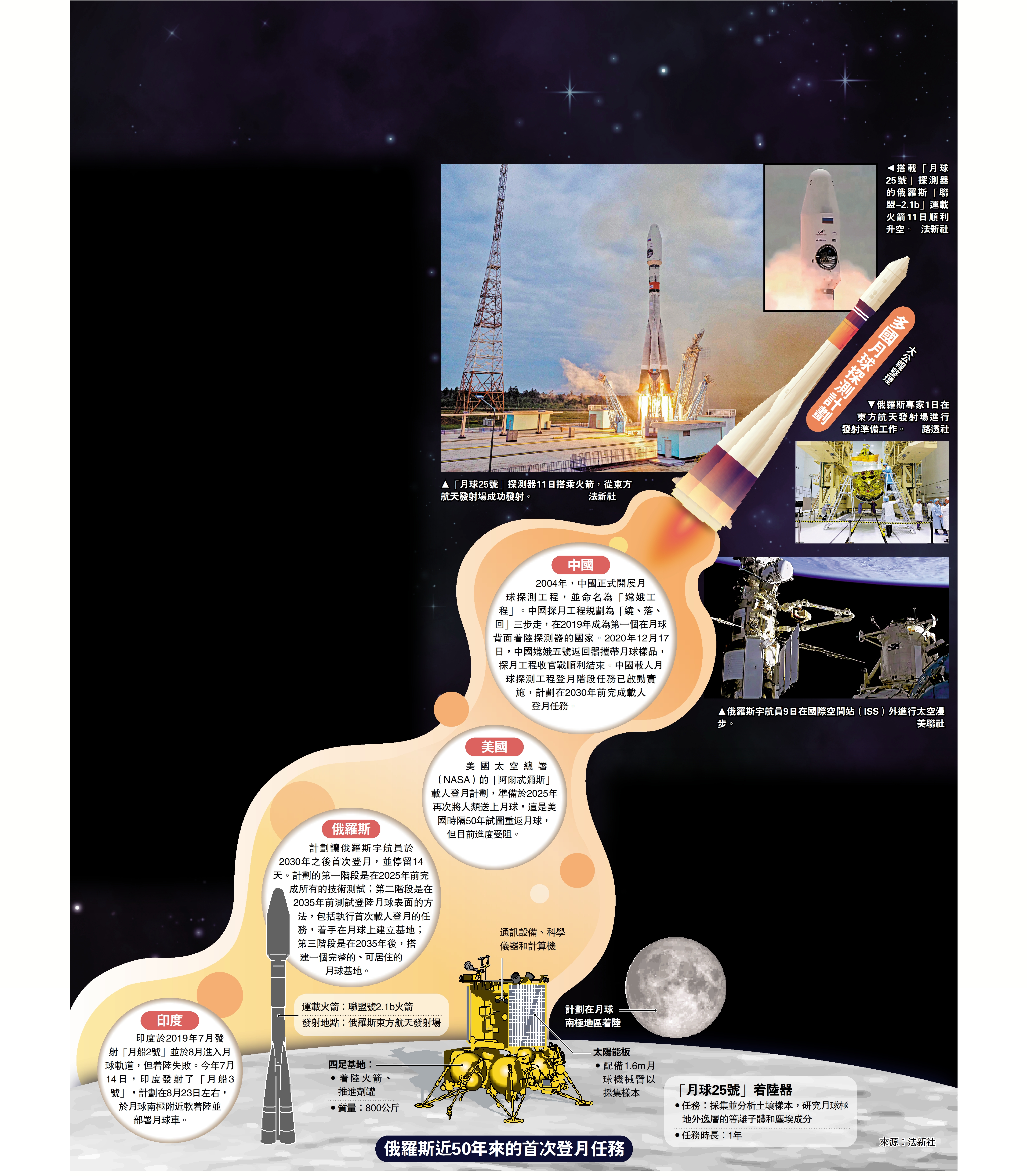 當地時間11日凌晨2時10分(本港時間早上7時10分),「月球25號」搭乘「聯盟-2.1b」運載火箭,從俄羅斯遠東地區阿穆爾州的東方航天發射場成功發射升空。約1小時後,探測器與火箭上面級分離,開始飛往月球。預計該探測器將首先進入繞地球軌道,約4.5天後進入月球軌道停留5至7天,最終於21日在月球南極博古斯拉夫斯基環形山附近着陸。